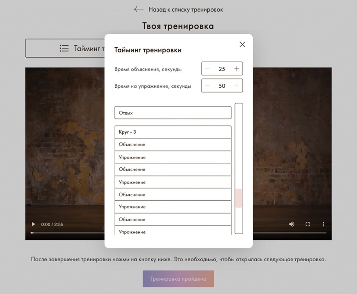 Интеграция Vimeo и настройка возможности выбора времени на объяснение и упражнения. Пользователи с разным спортивным опытом могут усложнять или облегчать свои тренировки