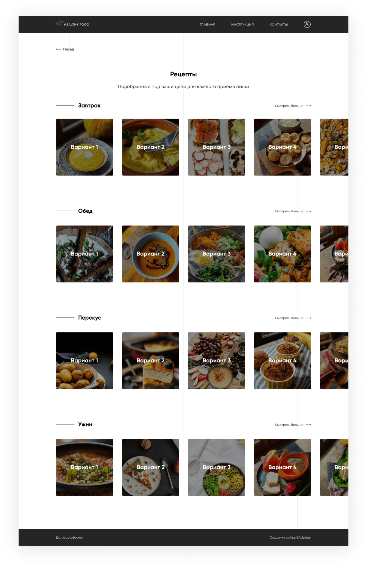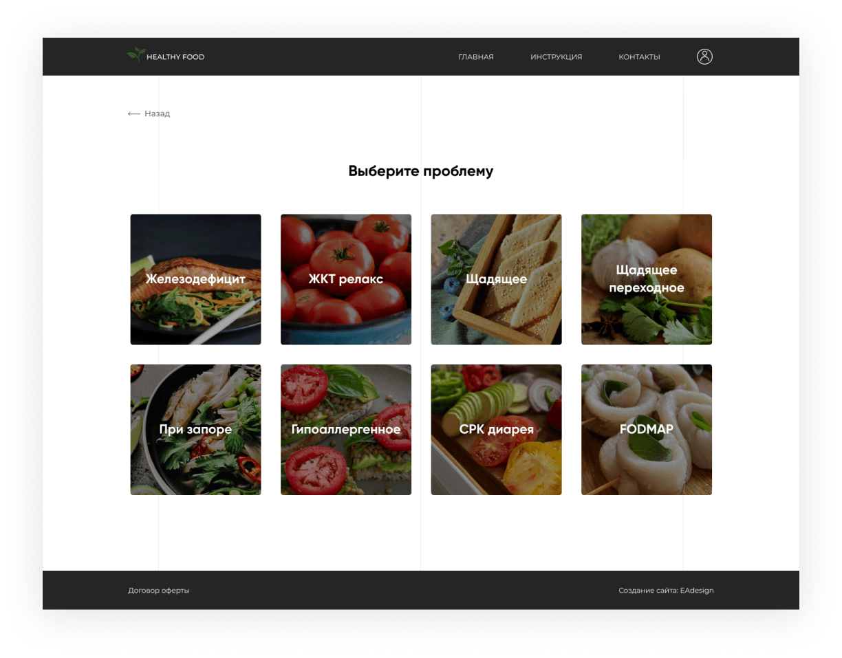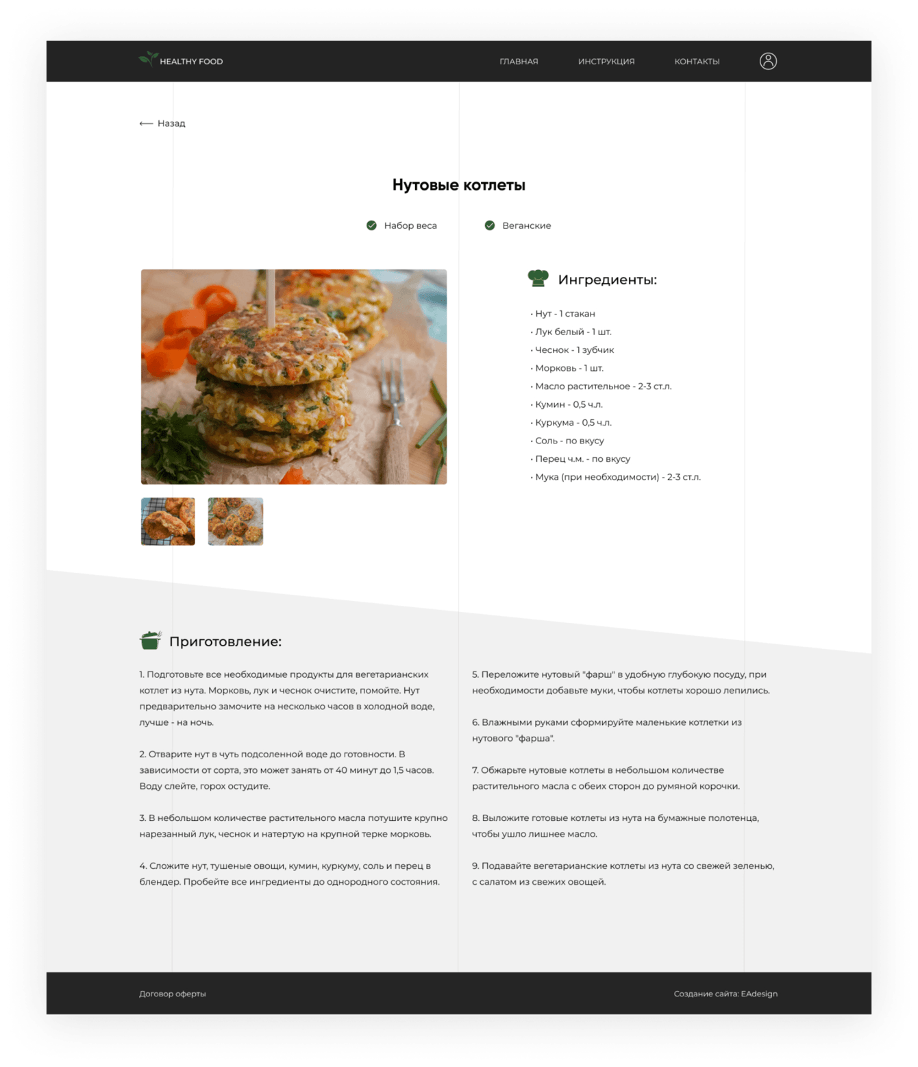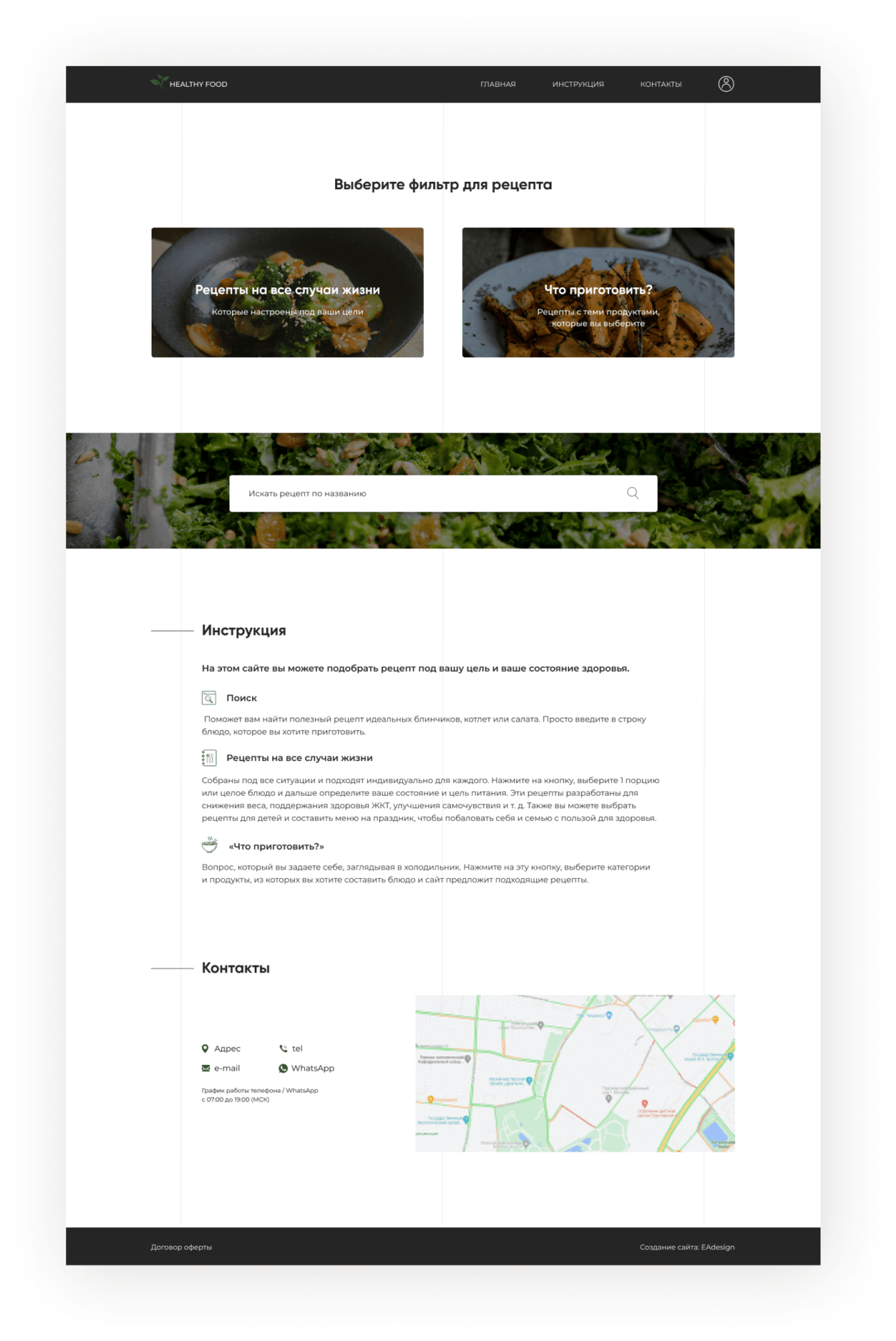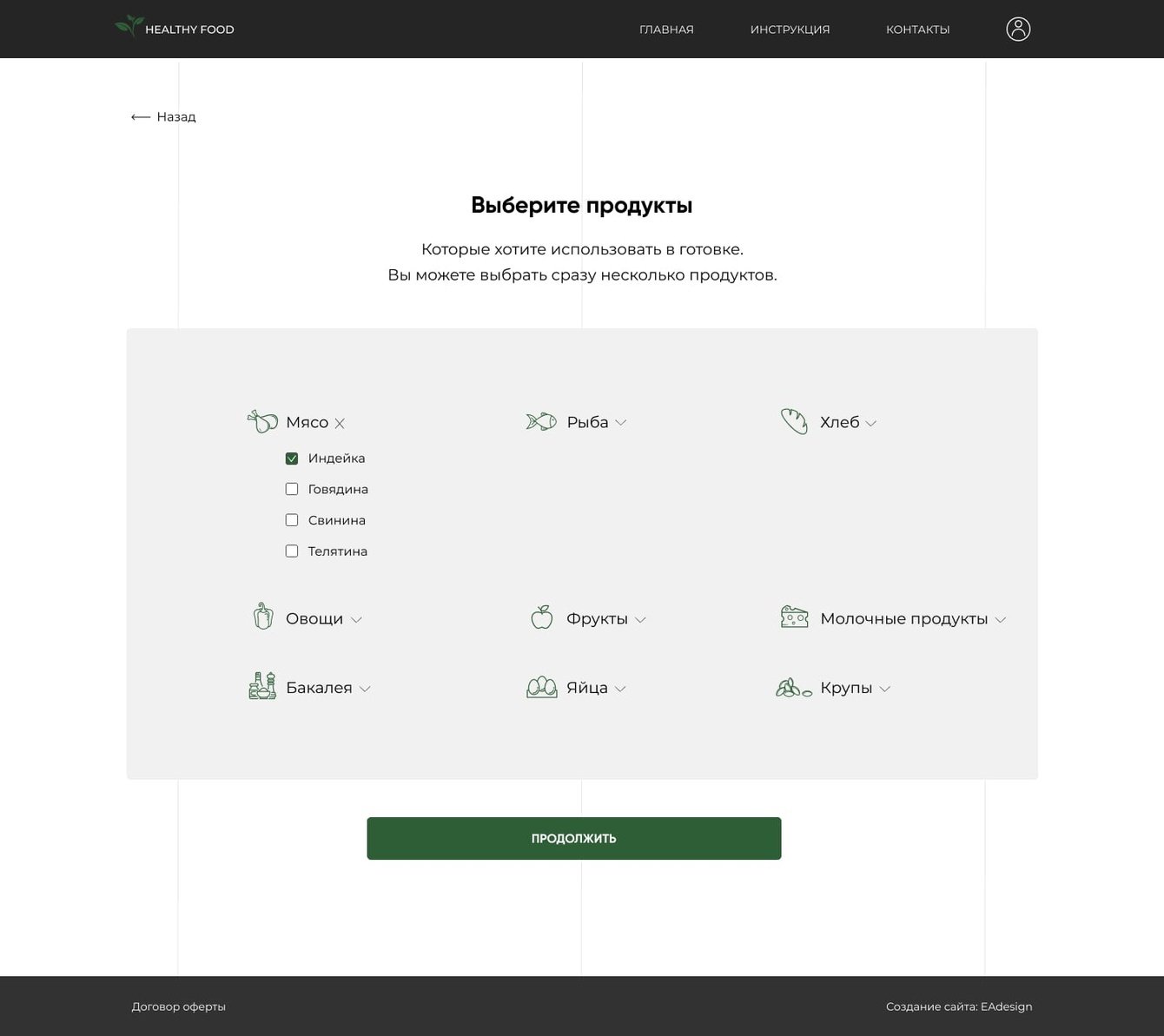 Автоматическая генерация блюд с учетом выбранных параметров, понятная навигация, стильный дизайн, удобное редактирование контента.