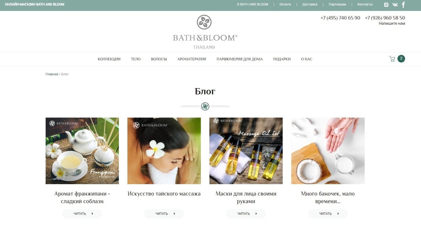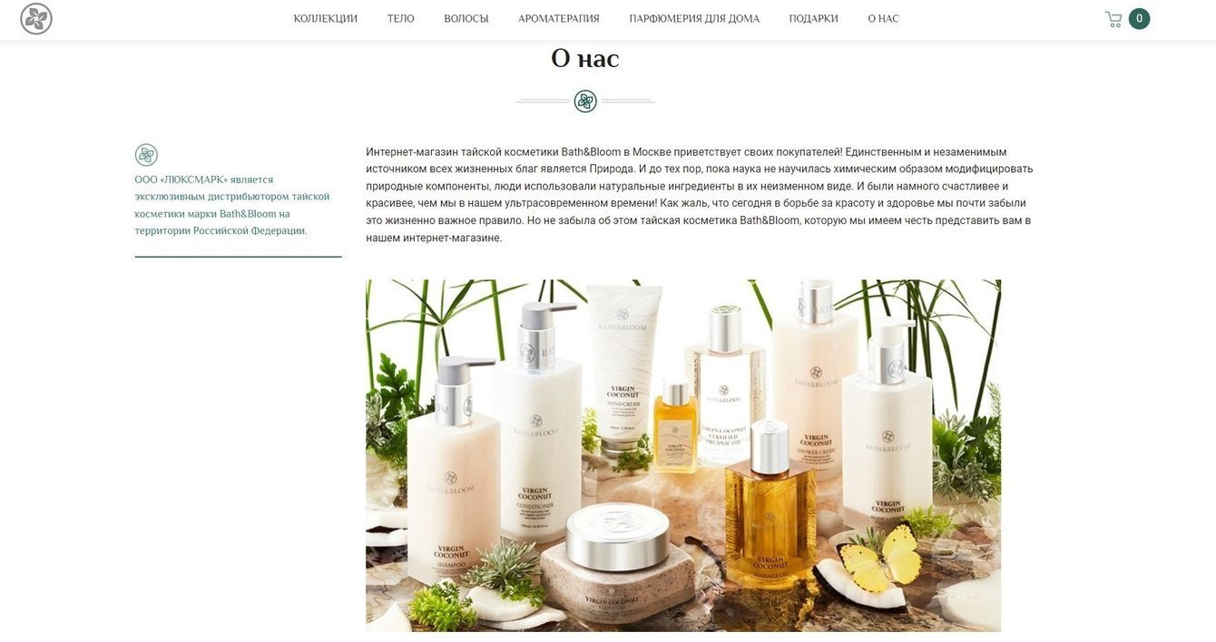 ООО «ЛЮКСМАРК» является эксклюзивным дистрибьютором тайской косметики марки «Bath&Bloom» на территории Российской Федерации. Марка позиционируется как натуральная и экологичная, начиная от состава продуктов и заканчивая упаковкой продукции в бумажные пакеты из вторичной и пригодной для последующей переработки бумаги. Дизайн онлайн-магазина BATH AND BLOOM должен был в полной мере передать это настроение и философию бренда.