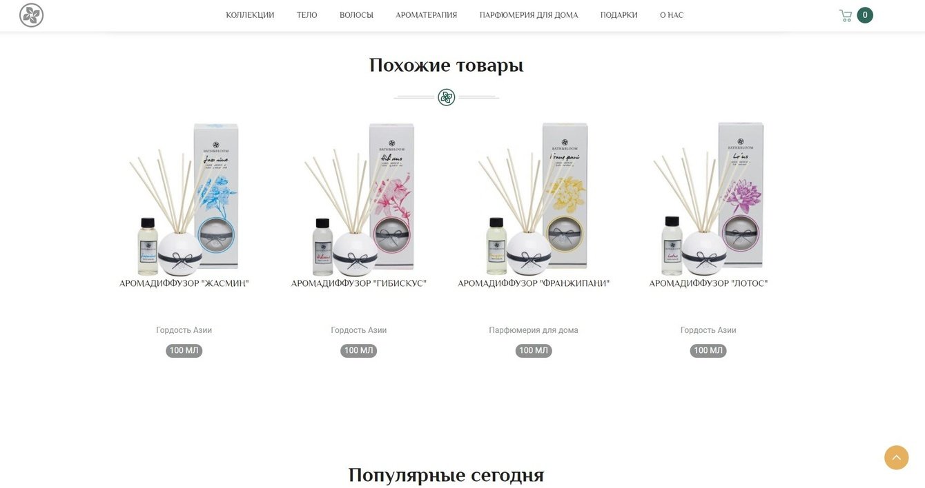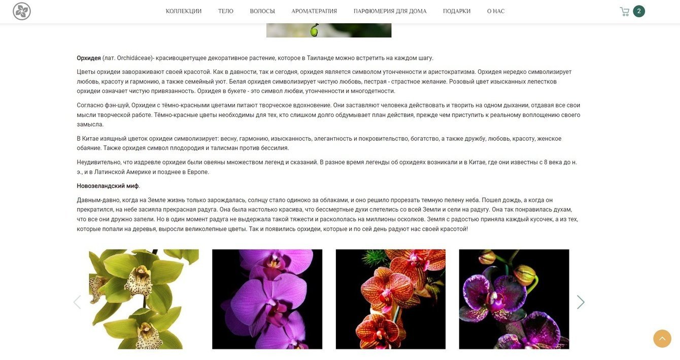 Аудитория интернет-магазина: любители натурального ухода, а также владельцы салонов красоты и частные мастера, массажные салоны (в ассортименте много масел для массажа, эфирных и для аромотерапии), которым удобно покупать в интернете материалы для работы. Для их удобства каталог продукции разделен по коллекциям и по назначению продуктов. В карточке товара, выполненной с использованием анимации и необычной прокрутки страницы, помимо описания, способа применения и мер предосторожности, размещены блоки похожих товаров и популярных товаров. Элементы анимации также были применены для баннеров и фотографий.