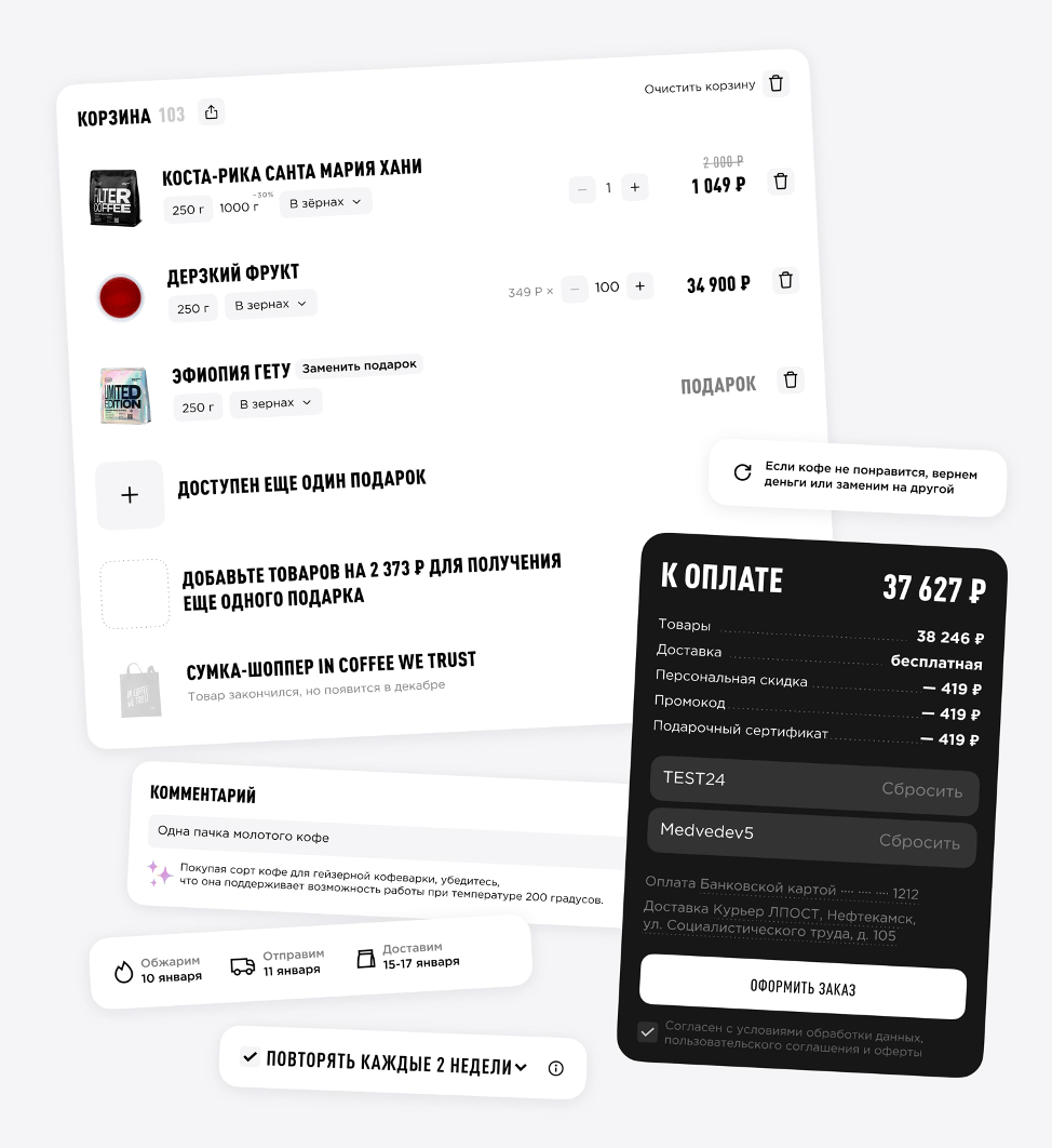 Интерфейс продуман так, чтобы все функции были на виду — не нужно искать информацию по сайту или обращаться в поддержку. Личный кабинет становится не просто инструментом для оформления заказов, а персональным помощником, который учитывает предпочтения, отмечает успехи и помогает выбирать кофе с удовольствием, делая процесс покупки более осмысленным и приятным.