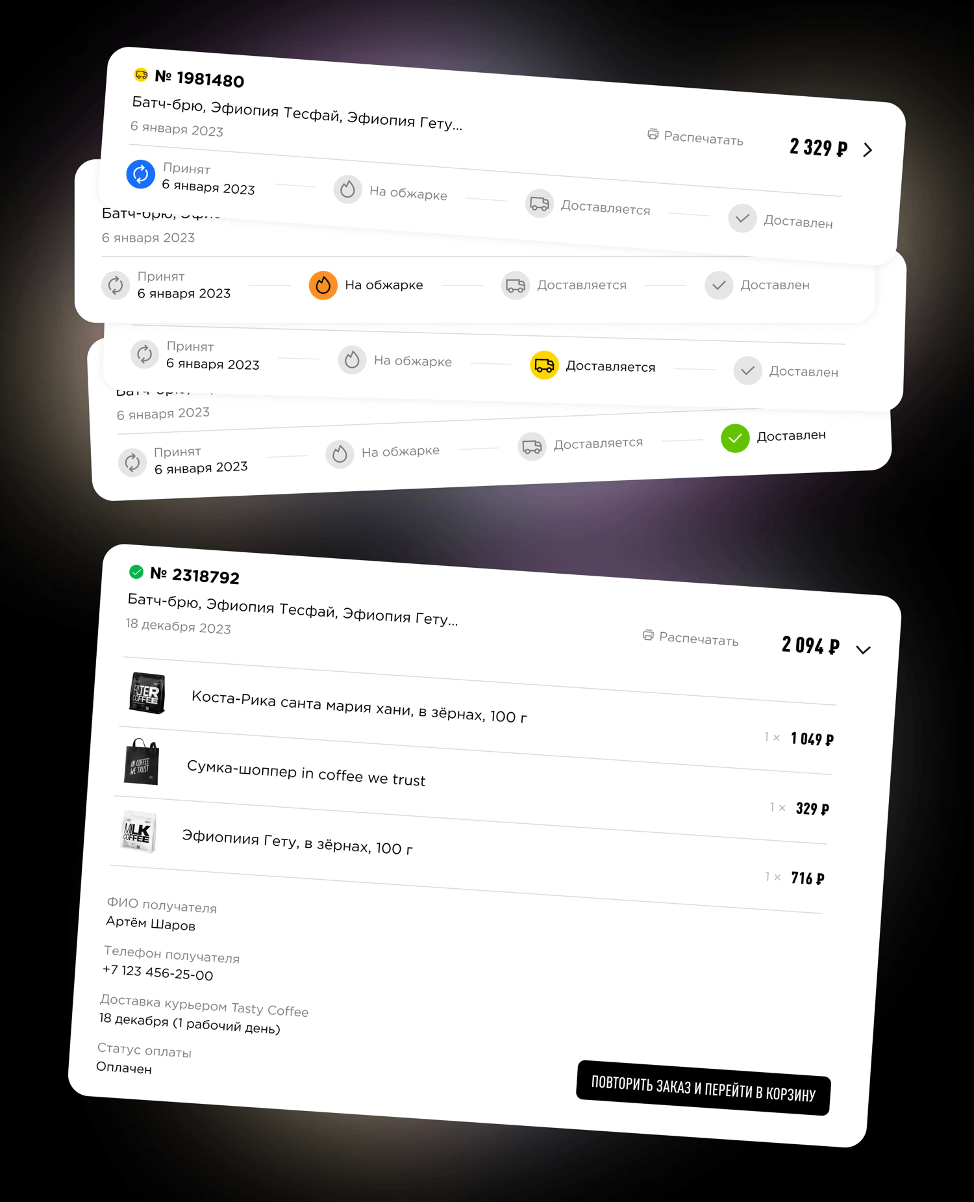Такое разделение позволяет клиентам легко отслеживать текущие заказы и быстро ориентироваться в истории прошлых, экономя время и делая покупки в «Тэйсти Кофе» более комфортными.