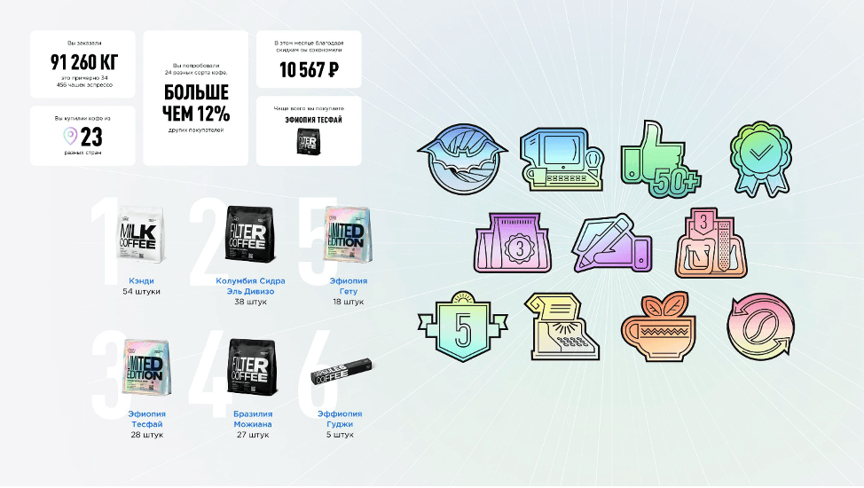 В разделе статистики представлена сводка по всем покупкам: общий объем заказанного кофе, самые популярные сорта, сумма сэкономленных средств благодаря подпискам и акциям. Эти данные помогают лучше понять собственные кофейные привычки и открыть для себя новые интересные варианты.