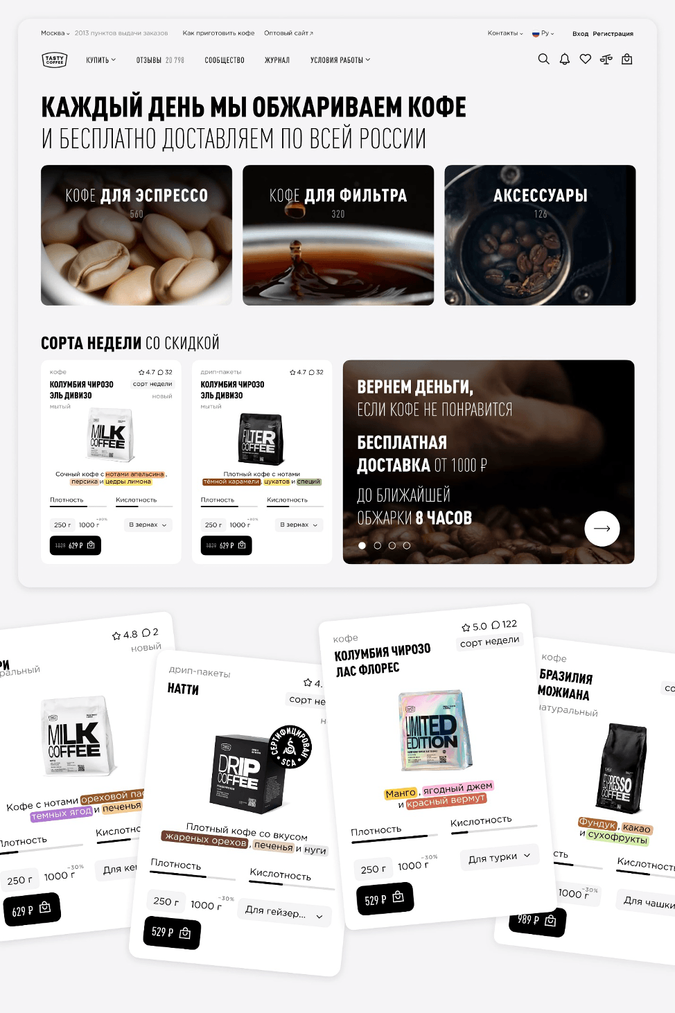 Главная страница обновленного интернет магазина «Тэйсти Кофе» оснащена виджетами для быстрой покупки, которые упрощают и ускоряют процесс оформления заказа. Интерактивные элементы хорошо заметны, но не перегружают интерфейс. С их помощью пользователь может добавить кофе в корзину и оформить заказ всего в пару кликов, без перехода на дополнительные страницы.