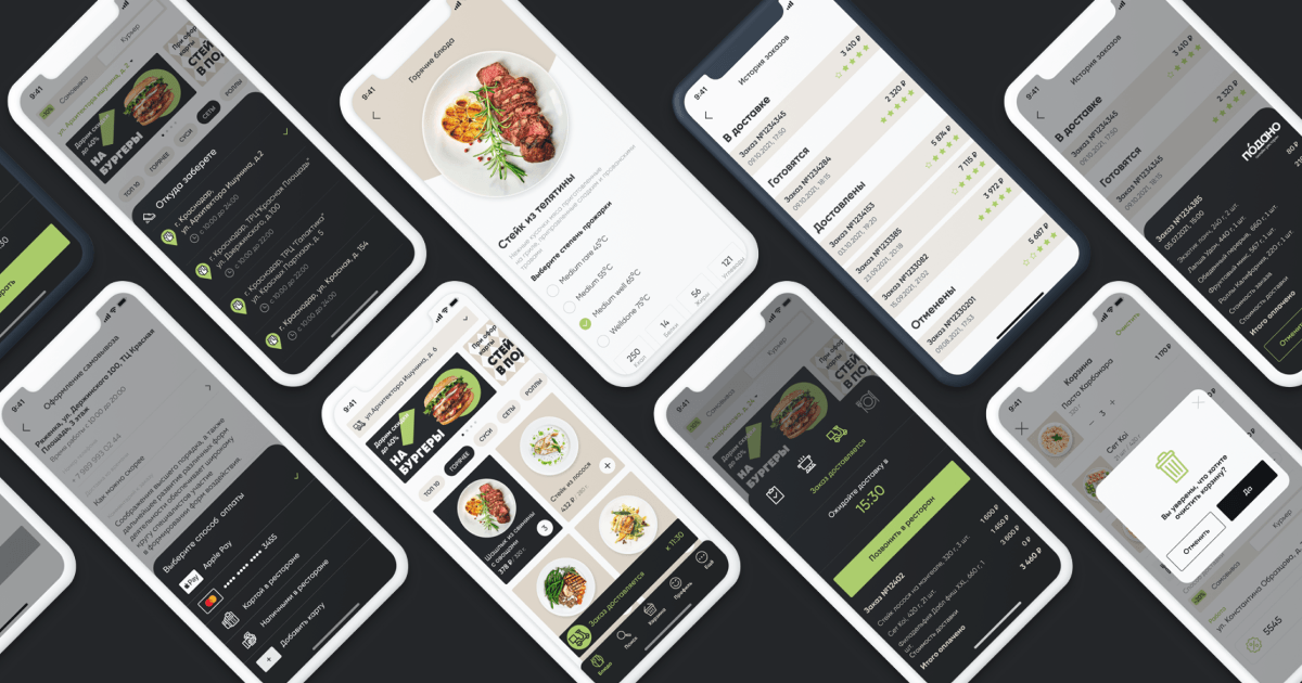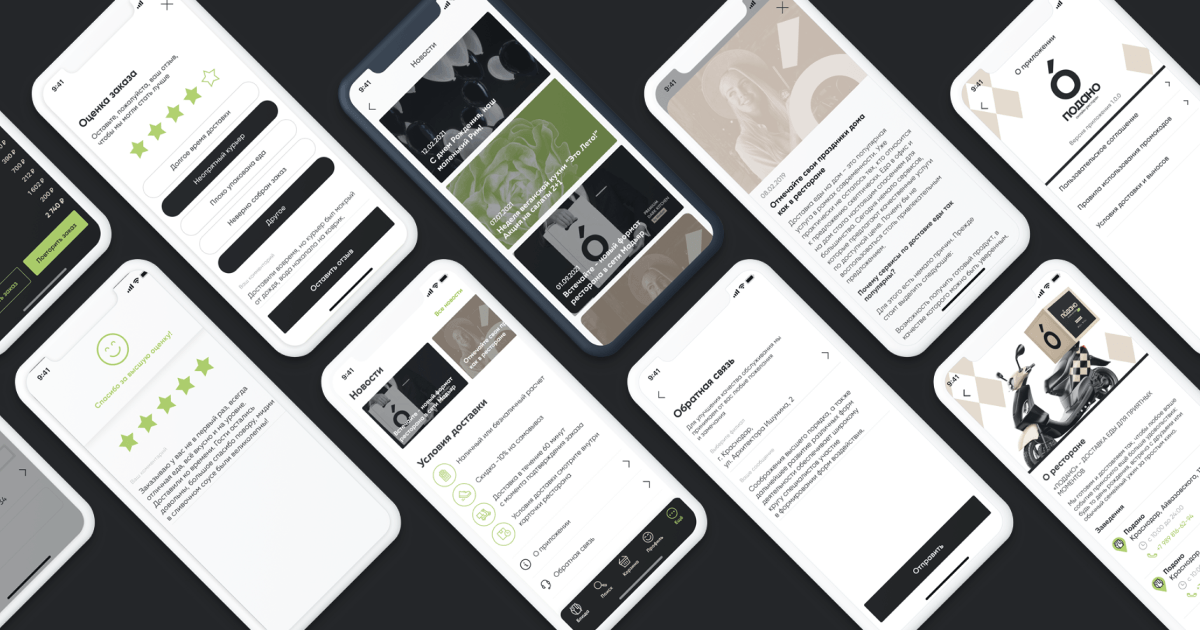 Доставкой занимаются собственные курьеры. В ожидании заказа клиент видит статус: «Принят», «Готовится», «Доставляется» или «Доставлен». При переходе на другой экран статус сворачивается в виджет с таймером. Он доступен в любом месте приложения, помогая клиенту распоряжаться своим временем. Отзывы сделаны важной частью контроля качества. Клиент даёт общую оценку удовлетворённости и может сообщить о проблеме в свободной форме.