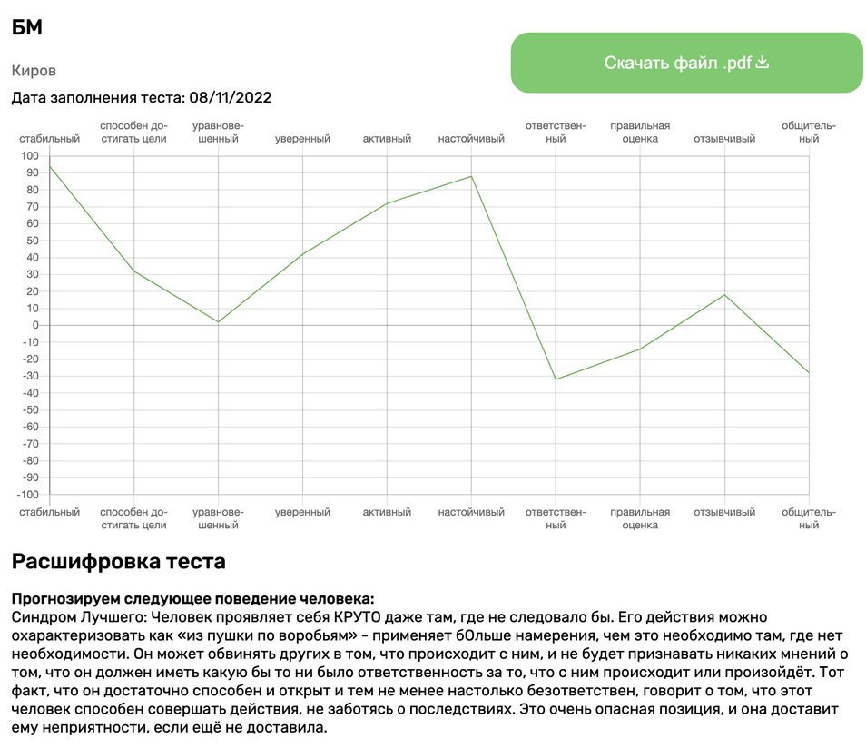 После прохождения теста приходит развёрнутый ответ и анализ результата. Результат представлен в виде графика и подробной расшифровки, который можно скачать в формате PDF.