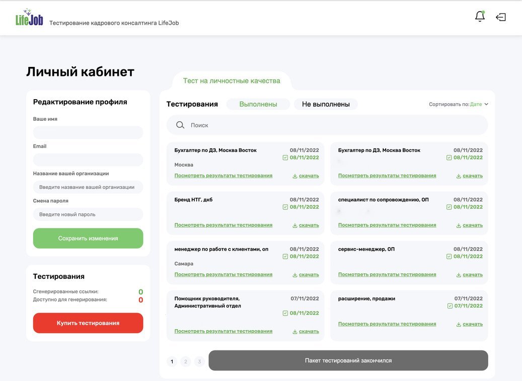 По окончанию купленного пакета тестов, пользователь в ЛК может оформить заявку на приобретение новых тестов, которая уходит в CRM “LifeJob”.