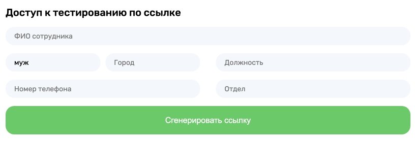 Для прохождения тестирования необходимо сгенерировать ссылку и отправить ее кандидату или сотруднику. Каждая ссылка уникальна.