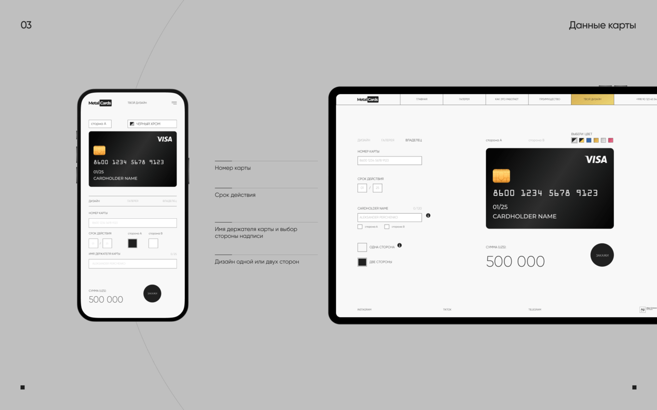 Отрисовав наброски интерфейса и собрав всю информацию, мы презентовали клиенту предварительную концепцию сайта. Клиент одобрил концепт и мы приступили к разработке онлайн-сервиса MetalCards.