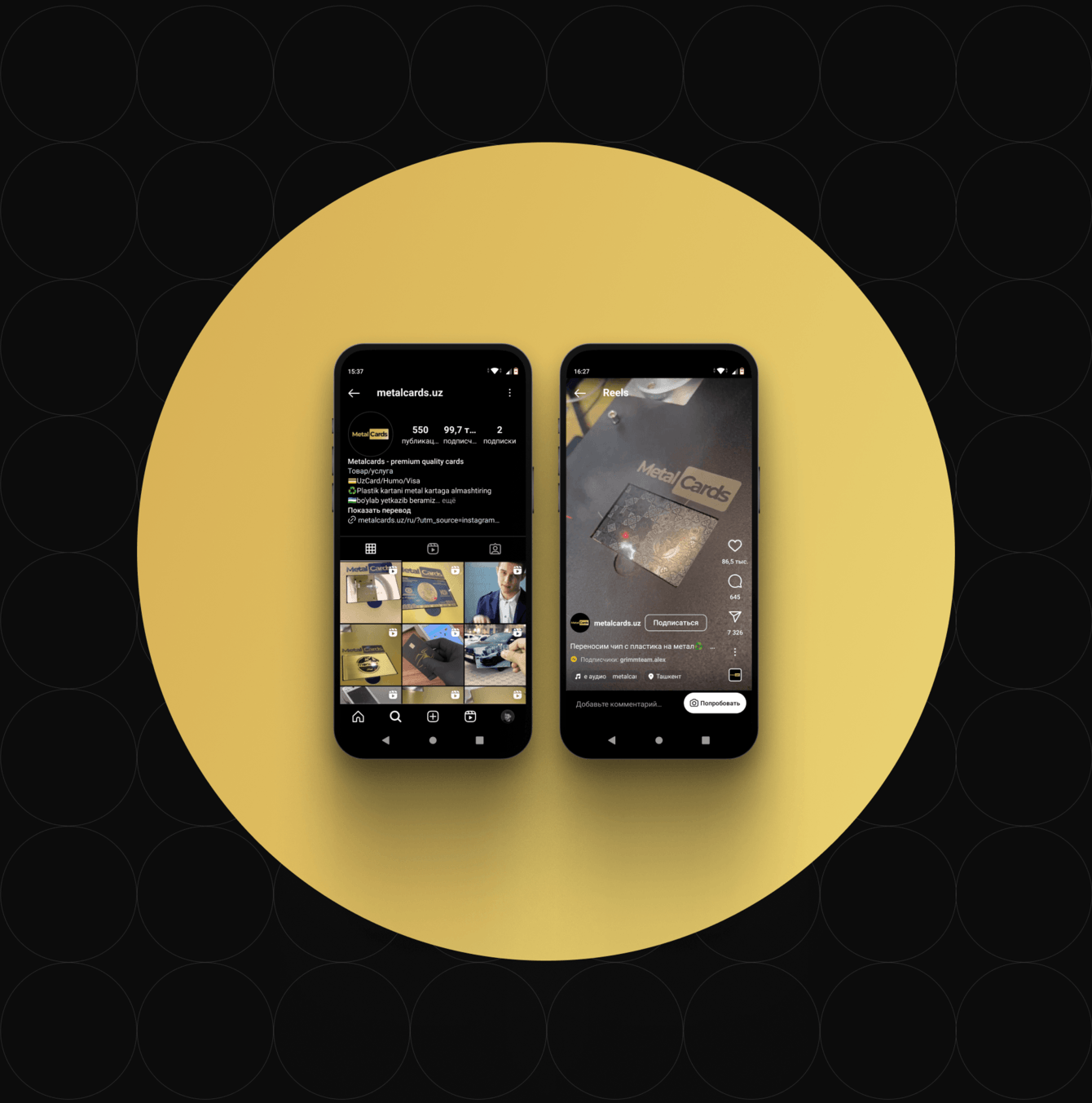 Параллельно с этим MetalCards запустил маркетинговую кампанию, привлекая местных блогеров и инфлюенсеров. Реклама была запущена в социальных сетях TikTok и Instagram*. Мы разработали дизайн для постов, выдержанный в фирменном стиле MetalCards.