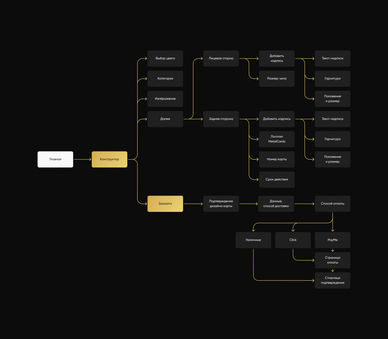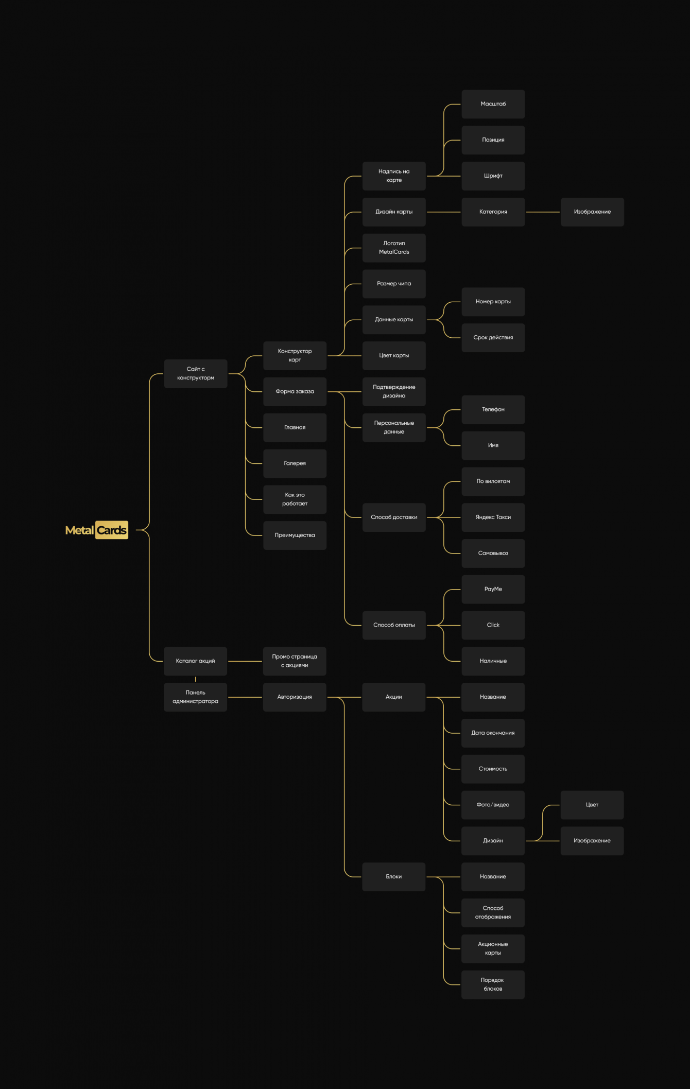 В конце ноября 2021 года к нам обратился Камронбек Осимжонов, автор проекта. Он рассказал о своей идее — разработать онлайн-сервис, на котором любой пользователь смог бы разработать персональный дизайн для металлической банковской карты с гравировкой. На тот момент у нашего клиента был только нейминг проекта — MetalCards.