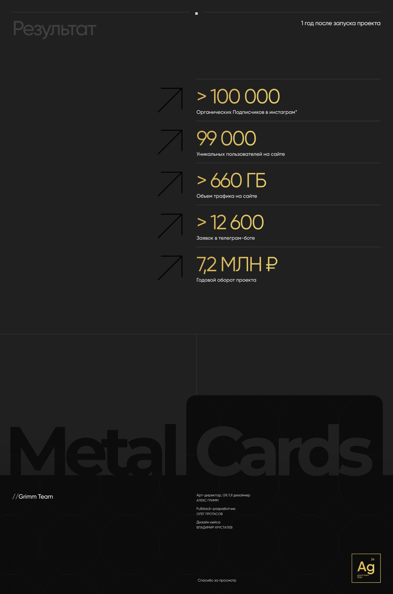 Прирост органических подписчиков поражал. Буквально за сутки на страницу подписывалось свыше 600-800 человек. Через 2,5 месяца после обновления сайта общее количество подписчиков превысило 86 000 человек. Ассортимент MetalCards пополнился новыми картами (голубыми, розовыми, красными, "хамелеон", зелеными, серебряными). Студия GRIMM TEAM обеспечивала стабильную поддержку на протяжении всего проекта.