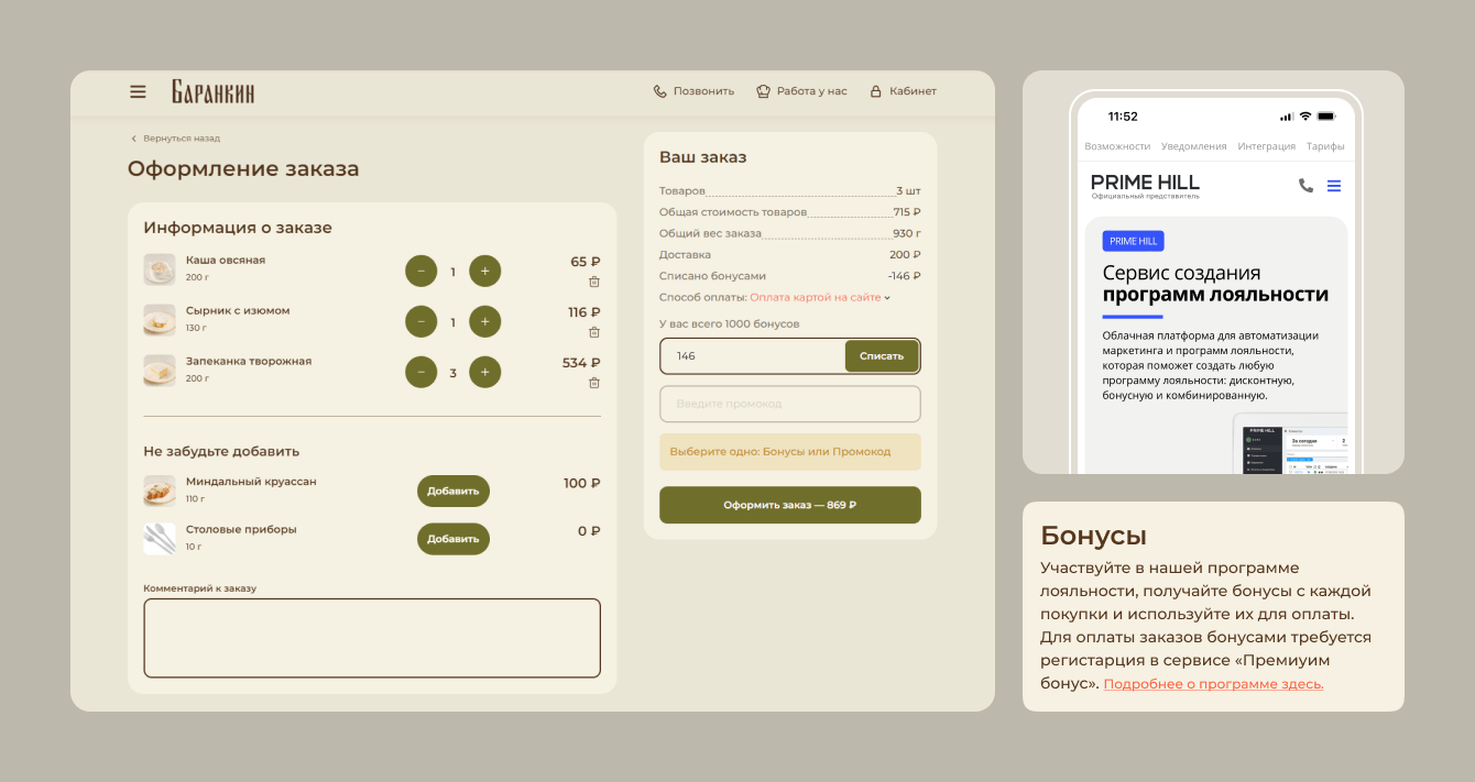 У «Баранкин» была программа лояльности для постоянных клиентов, которая работала только оффлайн. Чтобы покупатели могли использовать баллы онлайн и офлайн, требовалась интеграция сайта с бонусной системой.