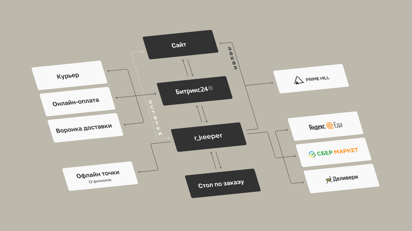Покупатель оформляет онлайн-заказ, который поступает в CRM-систему Битрикс24, дублируется в R-keeper, где автоматически создаётся стол. Блюда бронируются за конкретным заказом, сделка попадает в воронку доставки. При этом на сайте автоматически обновляются остатки блюд.