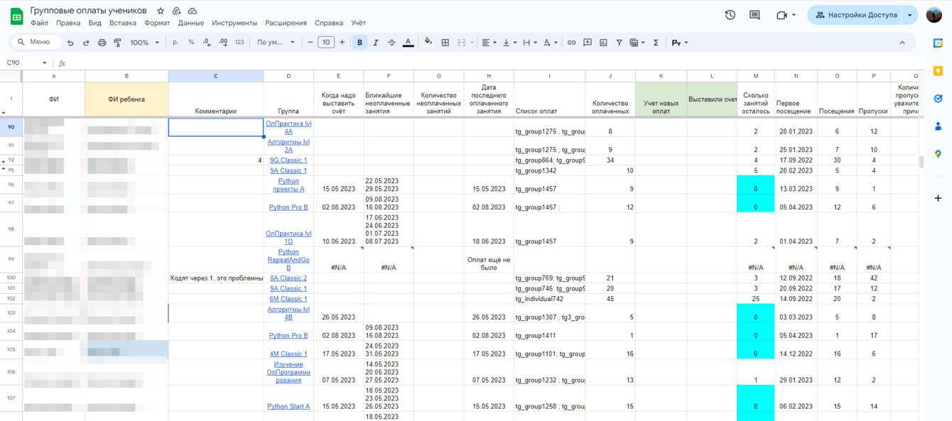 Учет оплат решили сделать в google таблицах, несмотря на непростые формулы и функции задач для менеджера был минимум, необходимо добавить ФИ ребенка, его группу на отдельный лист, после этого он автоматически появлялся в общем списке учеников, далее при оплате родителем пакета занятий менеджеру необходимо лишь указать тег оплаты который формирует наш бот и указать количество оплаченных занятий, после этого в таблице автоматически высчитывается количество доступных ребенку занятий, информация о его посещения подтягивается из ведомости группы, которую ведёт педагог и проставляет посещения каждому из учеников, таким образом учет оплат всегда покажет количество доступных занятий или долг ученика.