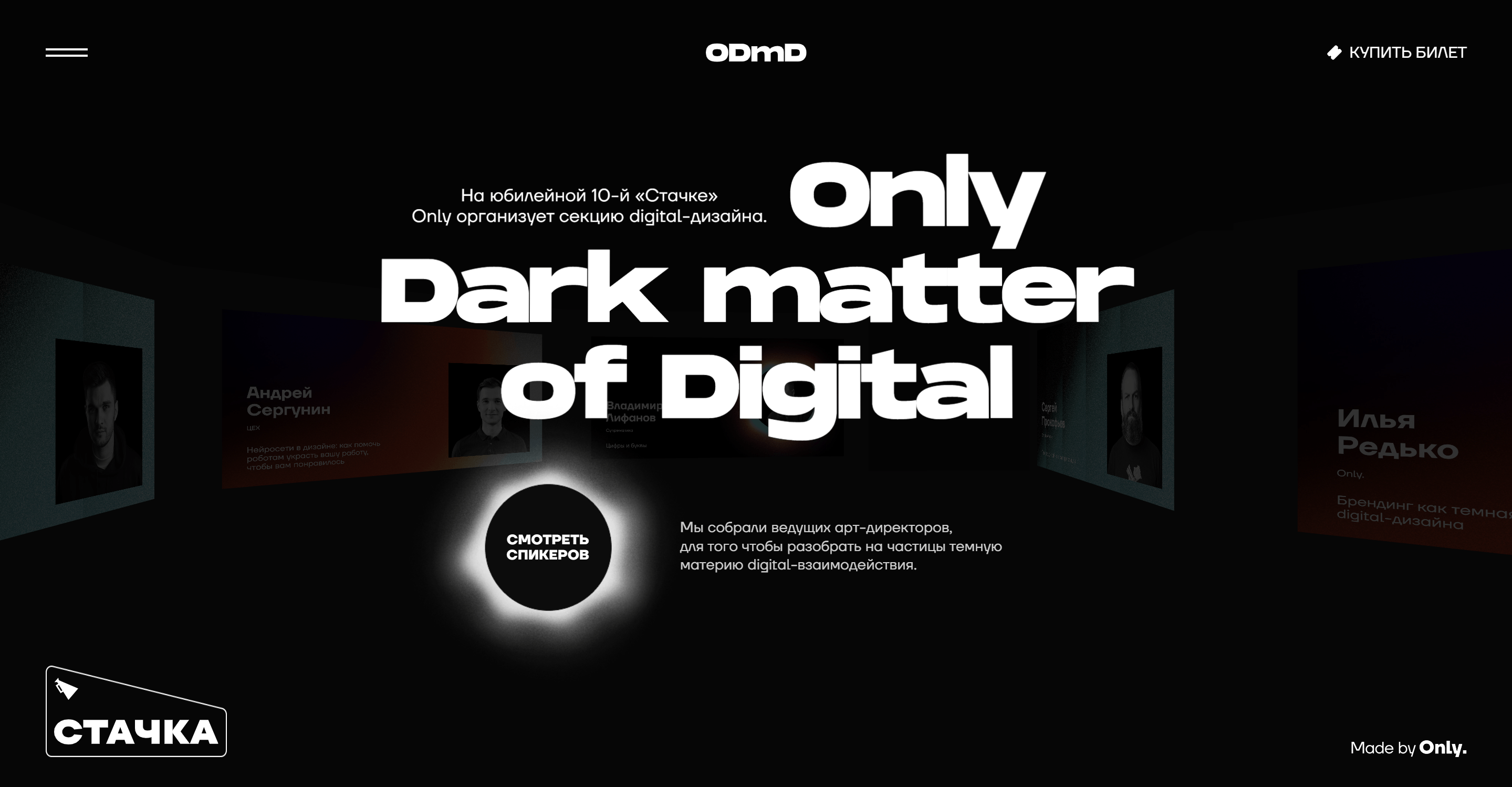 Дизайн промо-сайта Only Dark Matter of Digital — визуальное воплощение концепции о темной материи веб-дизайна, вдохновленное атмосферой загадок космоса. Метафорично, темная материя digital-дизайна — это сложные темы и вопросы, на которые нет однозначного ответа. Черно-белая палитра, неоновые градиенты, свечение черной дыры, интерактивная галерея спикеров — ключевые элементы дизайна.