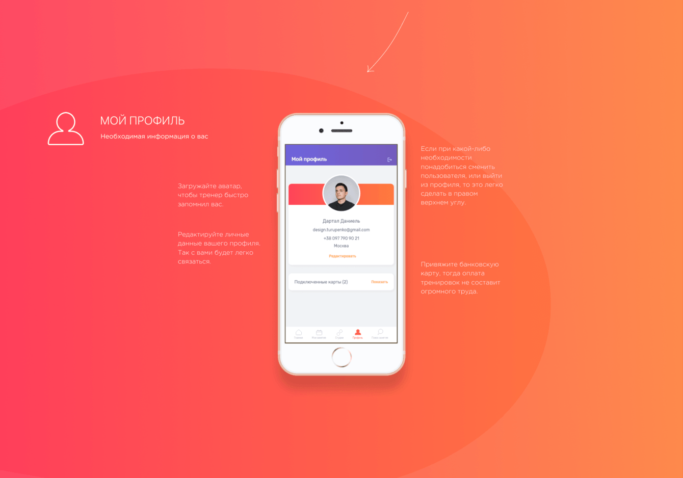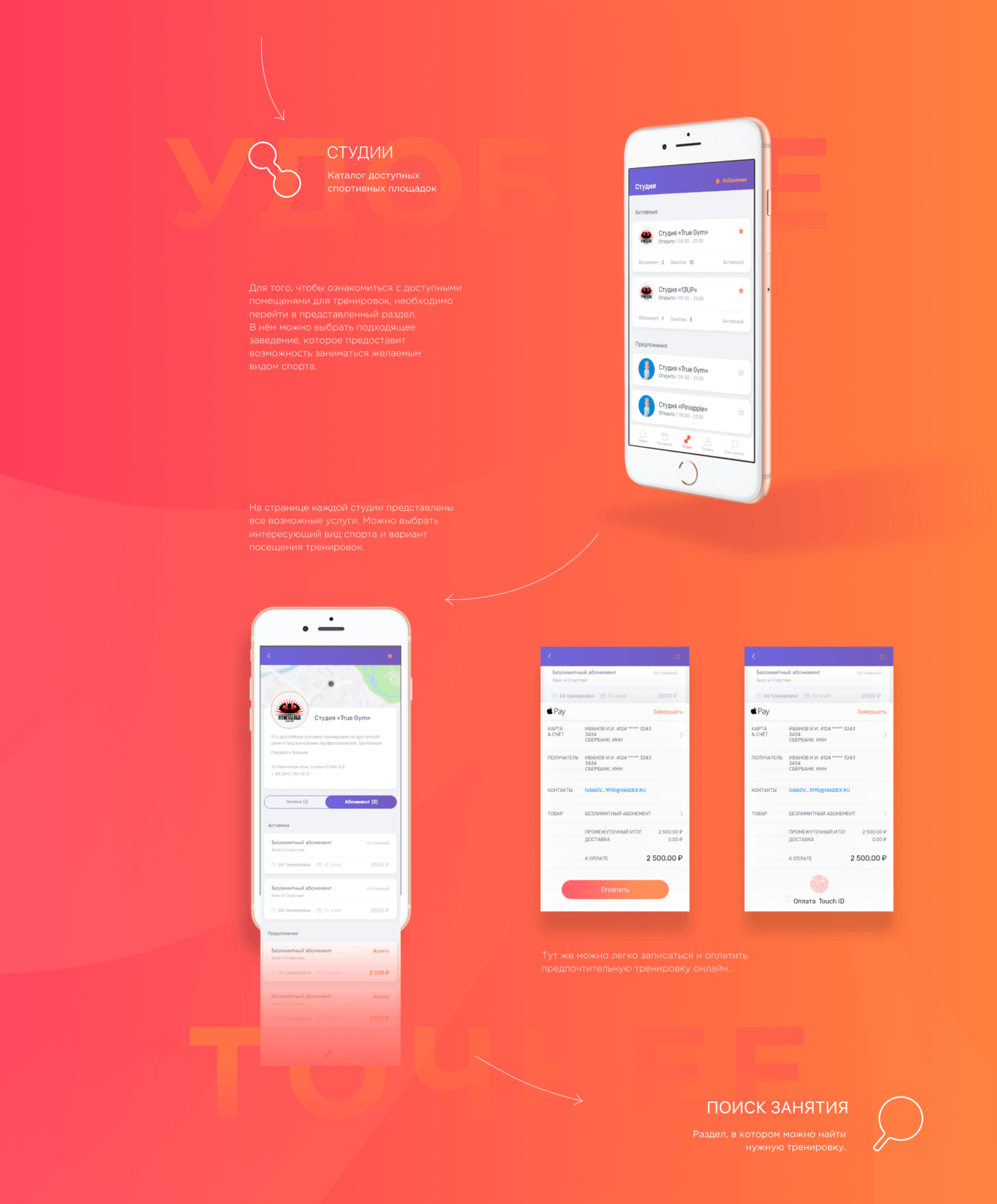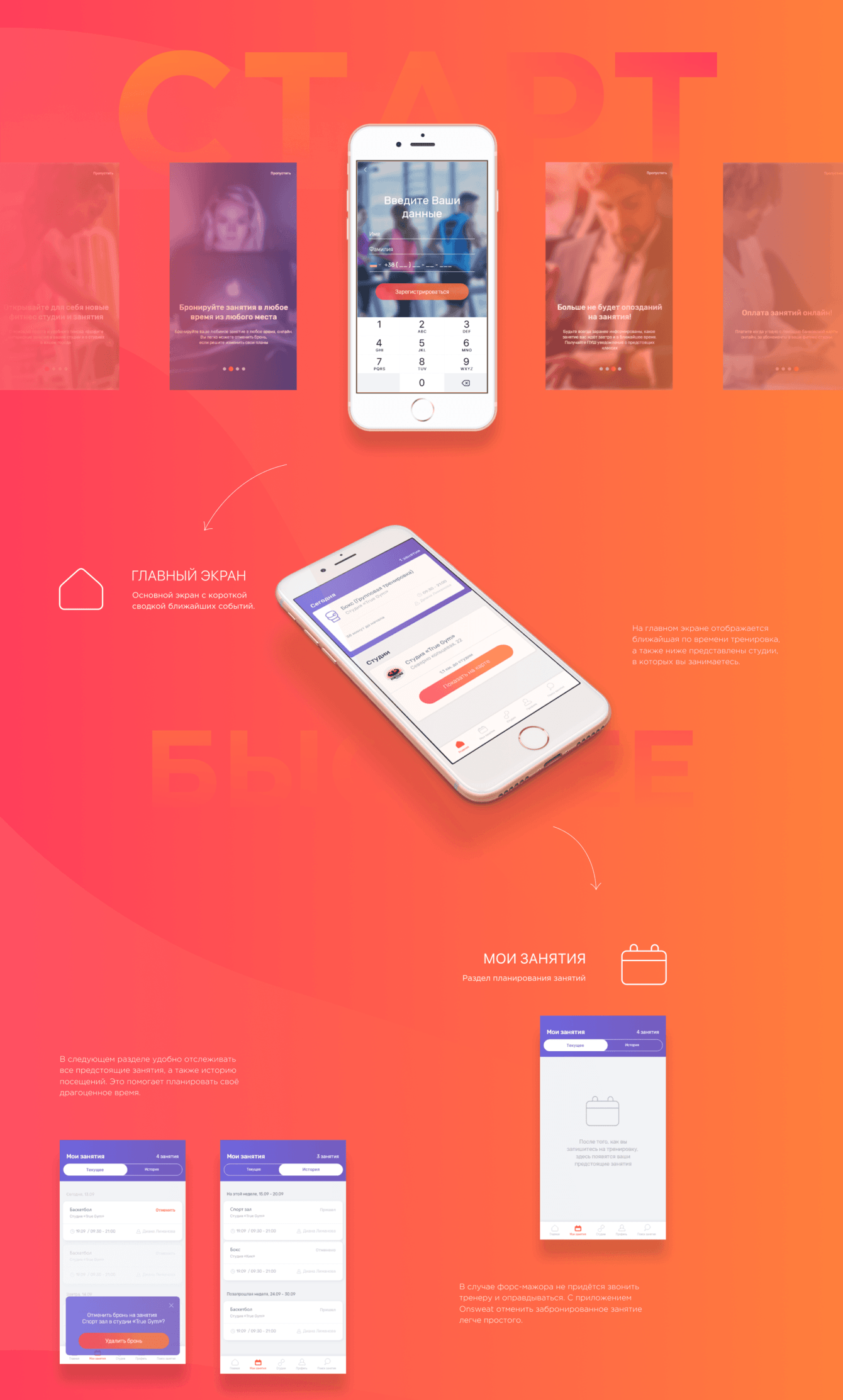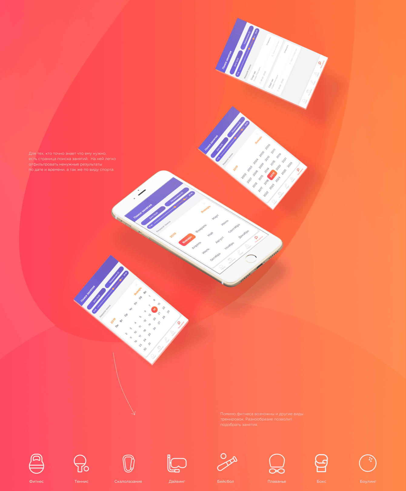 Удобный инновационный сервис для подбора занятий в фитнес-студиях по индивидуальным параметрам клиента. При оформлении приложения были учтены принципы лаконичности и доступности. Дизайн позаимствовал яркие цвета и спортивные образы, которые будут стимулировать пользователя тренироваться.