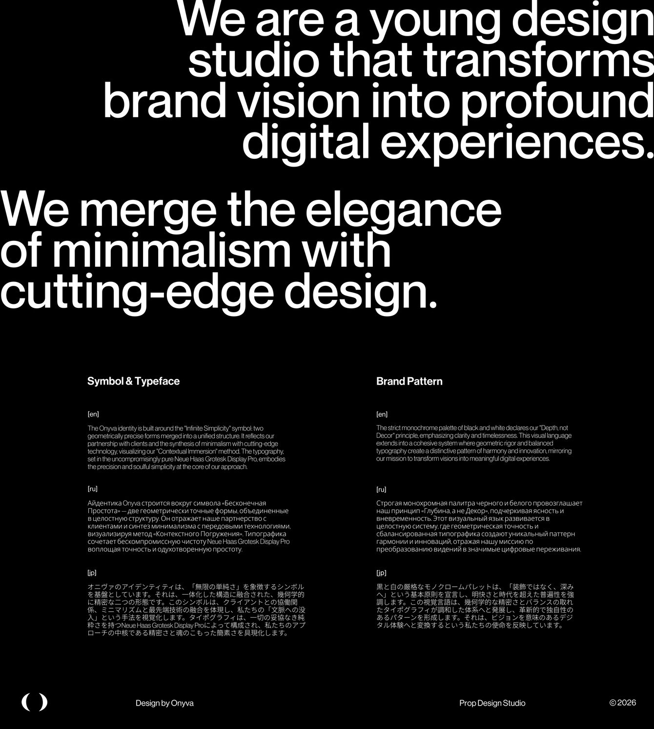 Onyva - это цифровой коллектив, который создает стратегические системы идентификации, основанные на принципе "Глубина, а не декор". Мы разрабатываем целостные визуальные системы с помощью нашего метода "контекстного погружения", сочетающего минималистскую элегантность и цифровую точность. Наша цель - не имидж, а смысловая архитектура, которая раскрывает суть бренда и создает глубокую эмоциональную связь с его аудиторией.