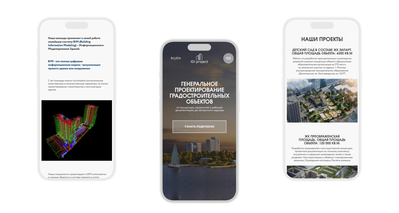 Компания IDI project специализируется на проектировании объектов комфорт, бизнес, премиум-сегмента и социальной инфраструктуры. Также компания объединила в своём составе сертифицированных НОПРИЗ опытных экспертов, лучших специалистов отрасли, работающих с применением технологии информационного 3D моделирования (BIM) над комплексной жилой застройкой и социальной инфраструктурой.