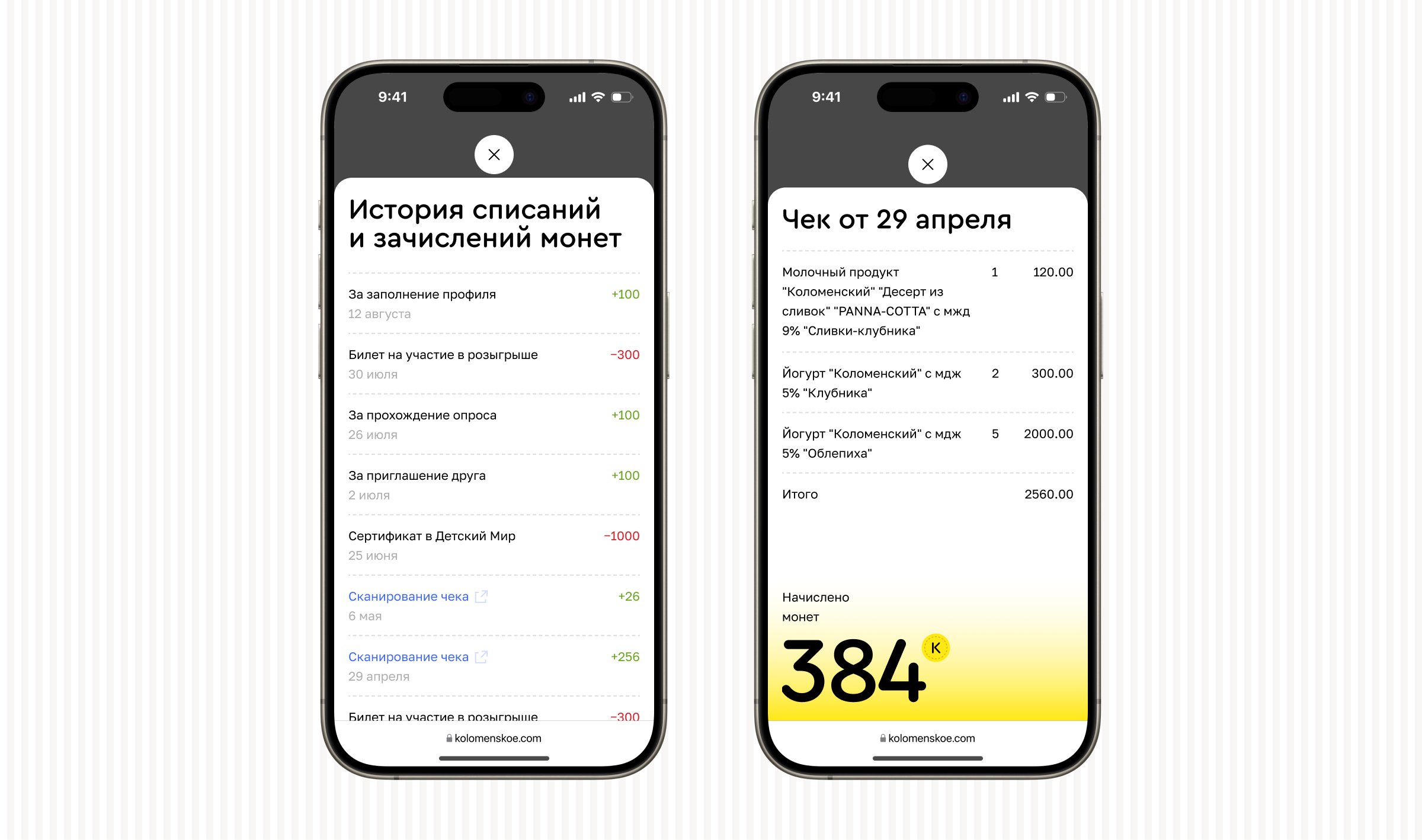 Разработать систему лояльности в личном кабинете — сканирование чеков и начисление баллов за продукцию ООО «Коломенское». Покупка сертификатов за баллы и билетов для участия в розыгрышах.