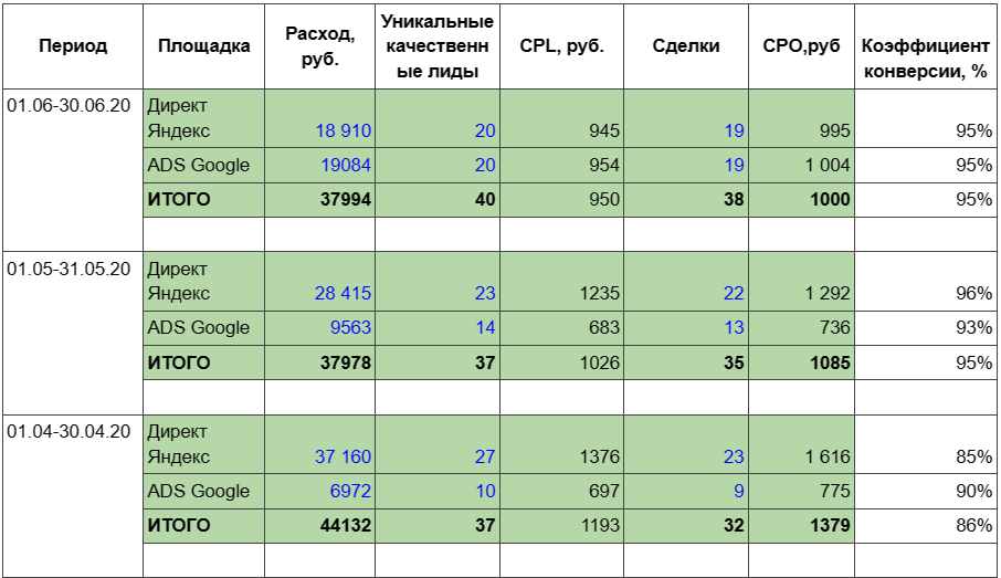 Количество уникальных качественных лидов варьировалось от 35 до 45 в месяц при бюджете 50 тыс. руб. Мы достигли отличного результата и смогли “вытащить” фирму из долгов, также благодаря совместной работе с отделом маркетинга и отделом продаж, который работал с полученными лидами и выстраивал долгосрочные отношения в дальнейшем.