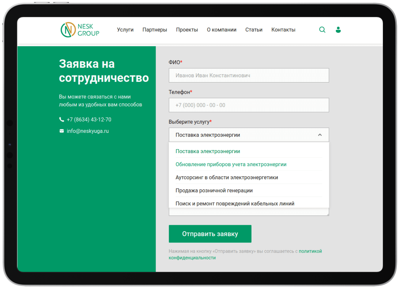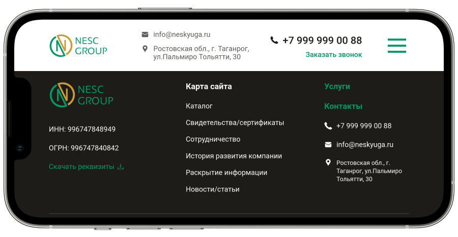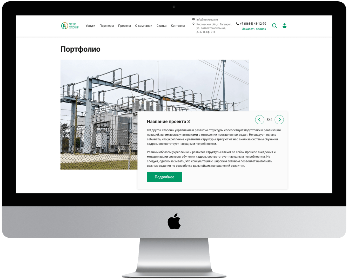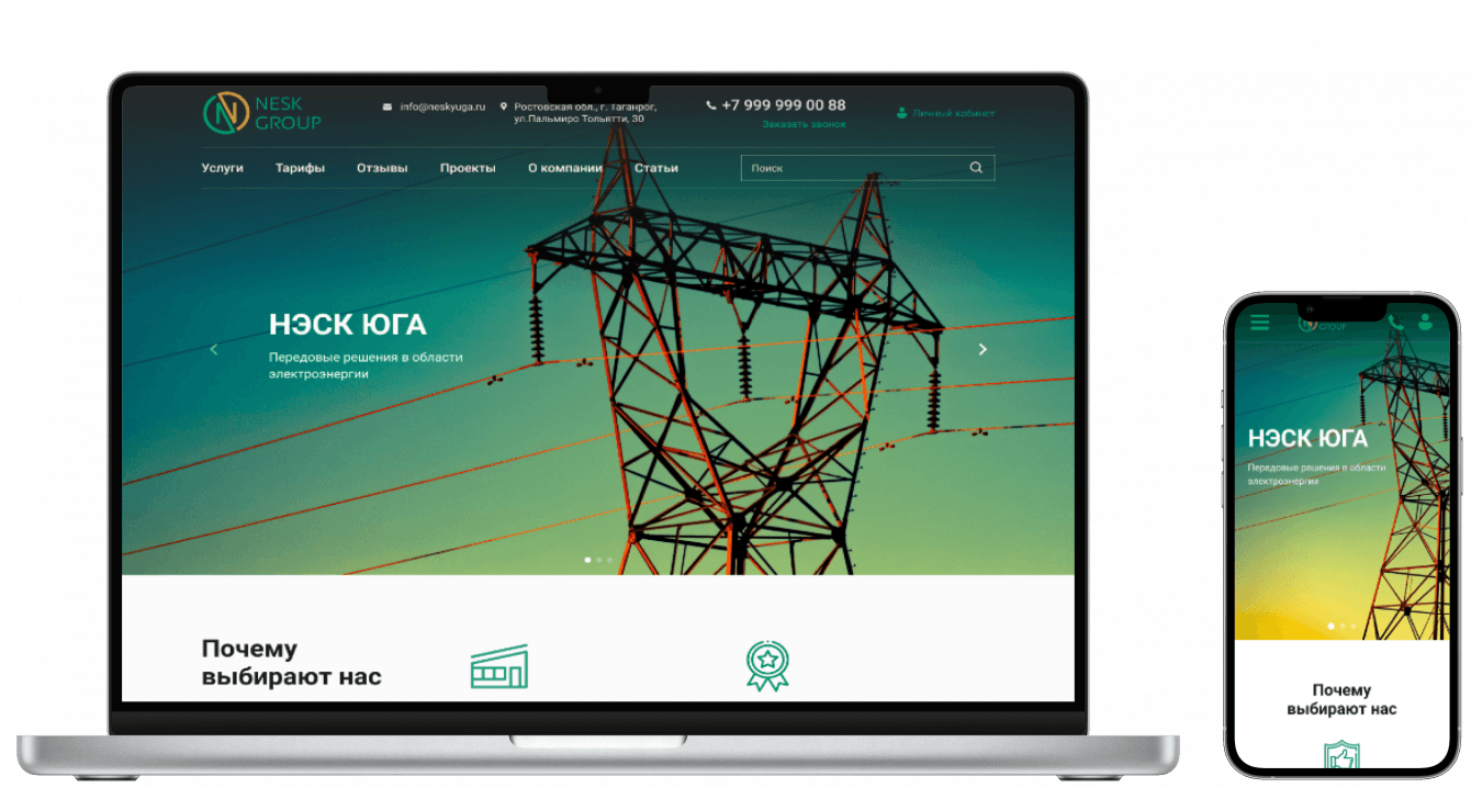Так как компания НЭСК ЮГА является, современной компанией, которая выходит в онлайн и имеет огромное желание предоставить своим клиентам сервис на сайте, мы предложили им разработать корпоративный сайт с индивидуальным дизайном, который включает в себя: