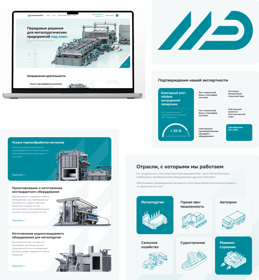 В результате проведённого ребрендинга и разработки корпоративного сайта ООО НПО «Металлэнерго» удалось достичь комплексного улучшения визуального и цифрового присутствия компании: обновлённый логотип, актуализированный брендбук и разработанный фирменный стиль убедительно транслируют ключевые ценности бренда — технологичность и надёжность. Созданный современный адаптивный сайт наглядно демонстрирует продукцию и услуги предприятия, а дополняющие его 3D‑модели и промо‑ролики существенно упростили восприятие сложной технической информации и укрепили доверие к бренду.