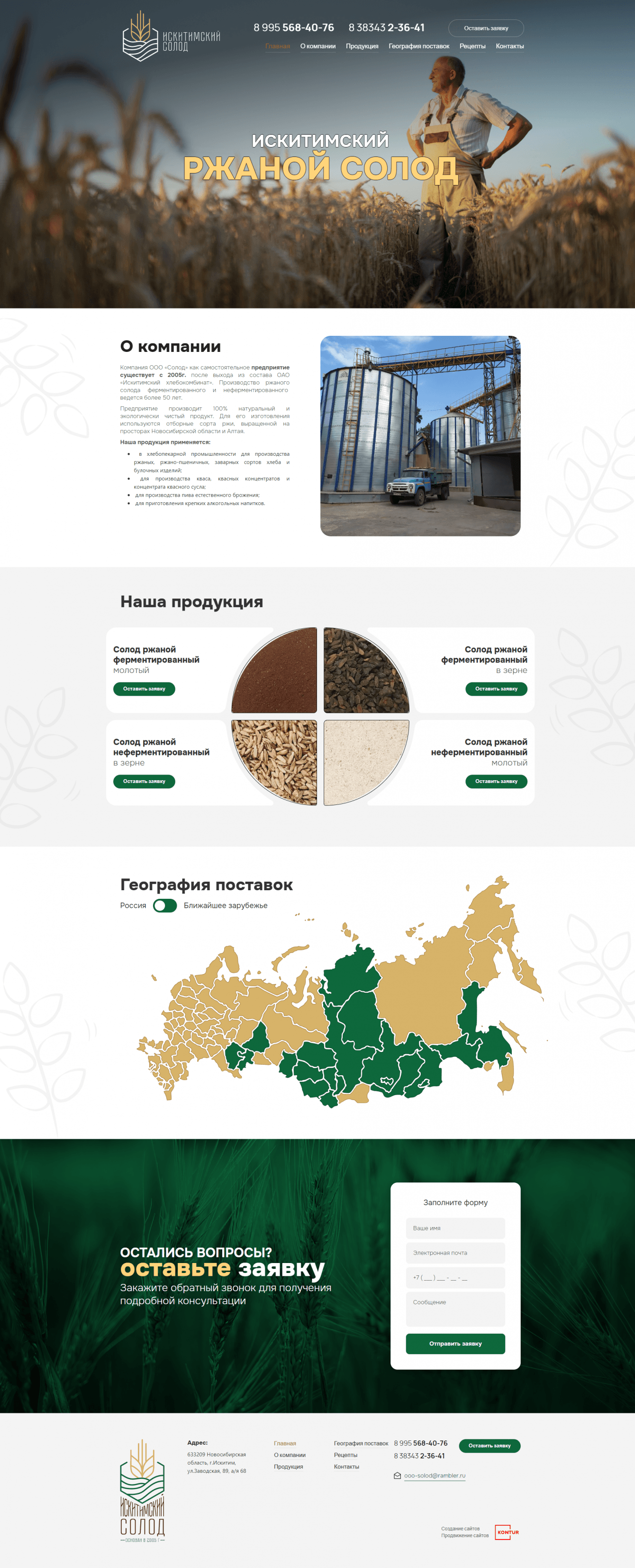 Мы создали простой, информативный и удобный сайт-визитку для компании ООО «Солод», на котором разместились как основная информация о производителе, так и форма для сбора онлайн-заявок. Было увеличено онлайн-присутствие, были привлечены новые клиенты. Таким образом, мы реализовали все запросы заказчика и запустили удобный сайт-визитку.