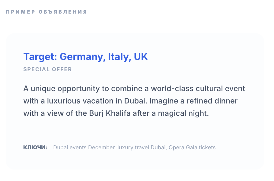 Европа: Таргетинг на путешественников + Интерес к Дубаю.