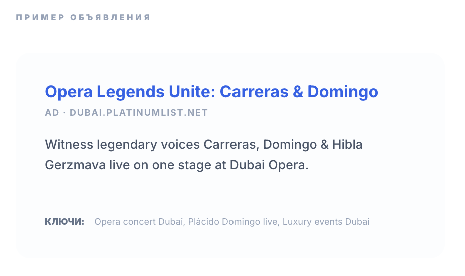 Брендовые запросы (Dubai Opera) + 'Events in Dubai tonight'.