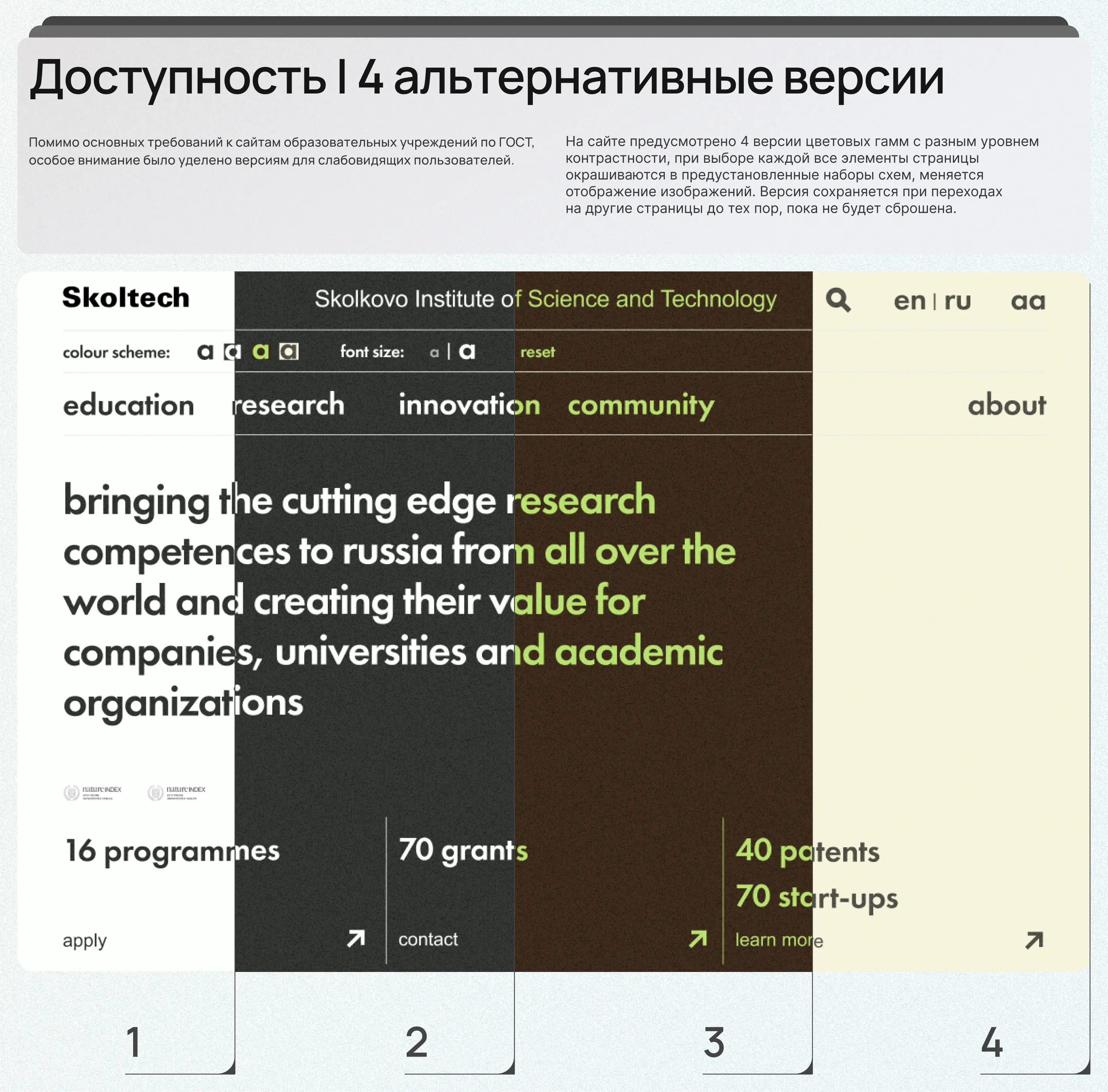 Разработка личного кабинета администраторов и фронтенда для информационного сайта Сколковского университета. Сайт позволяет выбрать подходящий поток, подать заявку на обучение, ближе познакомиться с расписанием курсов университета, узнать о событиях и новостях, погрузиться в программы исследовательских центров и лабораторий. Сайт предусматривает высокий уровень доступности для людей с ограниченными возможностями зрения.