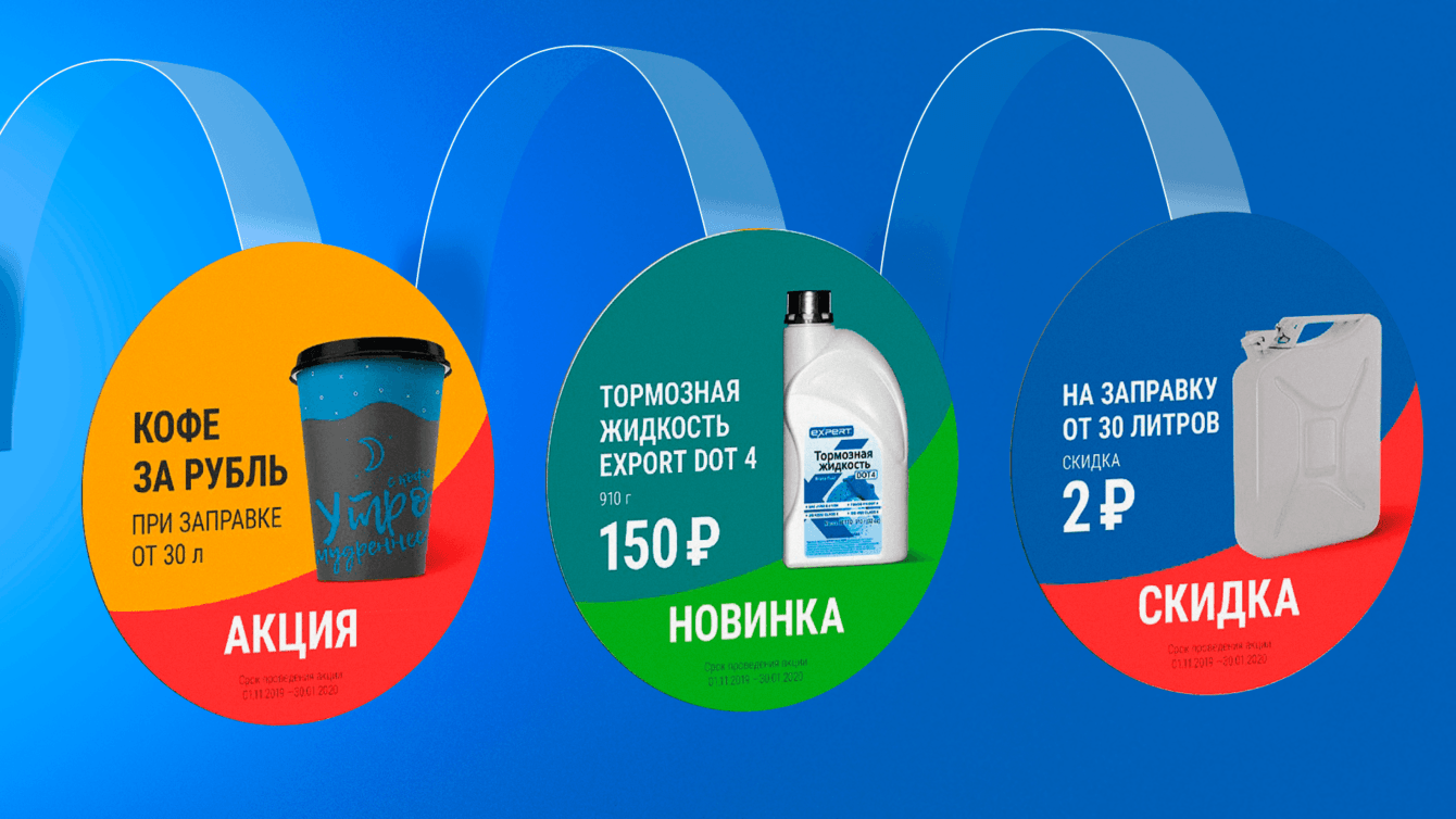 В рамках проекта мы построили стройную и понятную систему айдентики, основанную на текущих константах бренда и его материнской компании "Газпром нефть". После этого облегчили навигацию внутри заправки, создав цветовое кодирование POSm по различным категориям товаров.