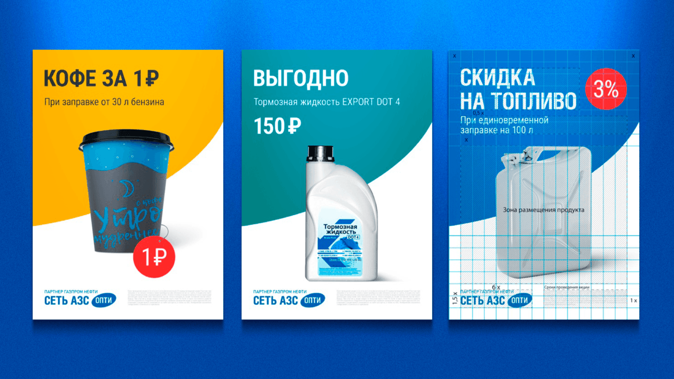 В итоге у сети «ОПТИ» есть готовая айдентика, позволяющая легко решать все оформительские задачи АЗС, и все необходимые для работы шаблоны POSm.