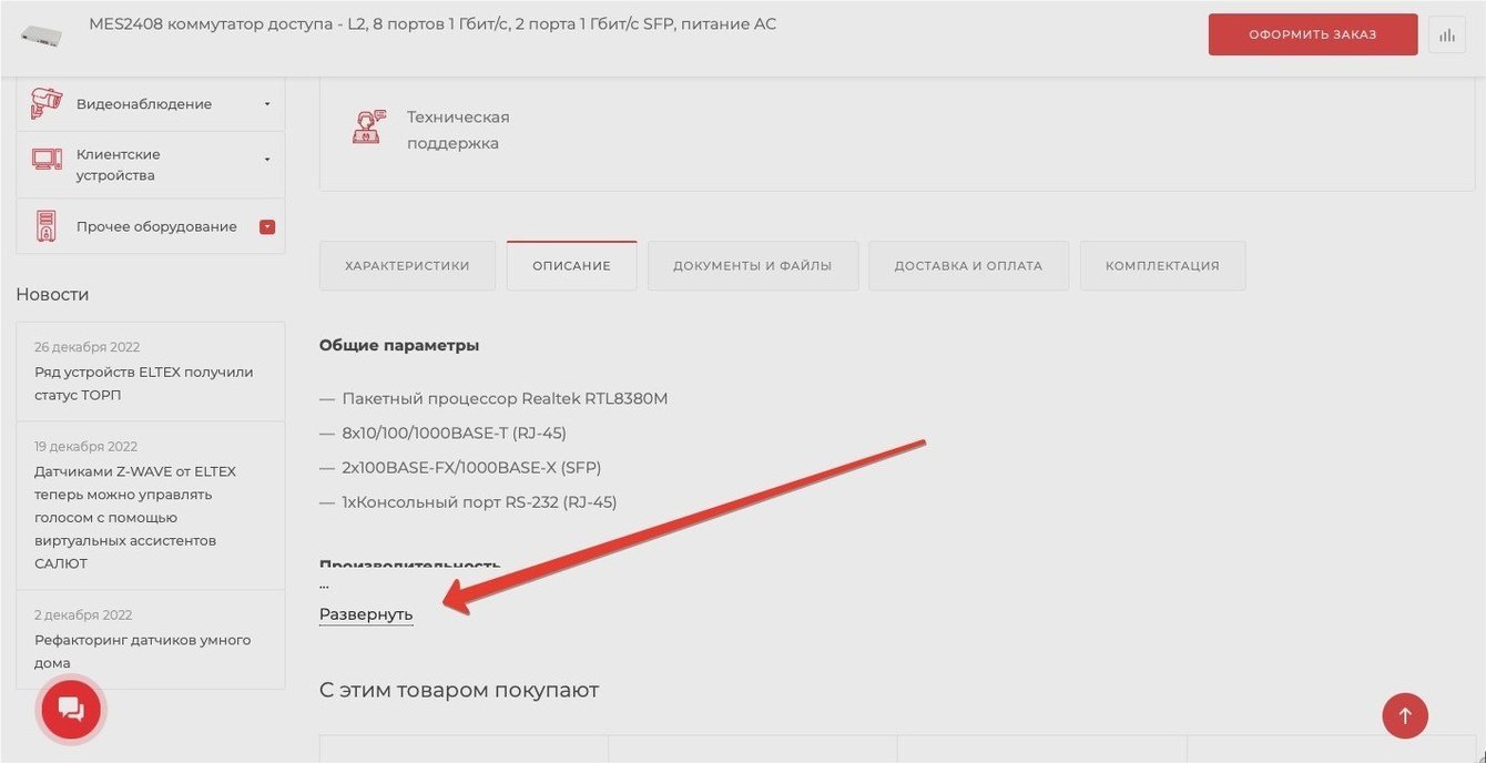 3. Дополнительно сделали функцию «Развернуть» в блоке «Описание». Такое решение позволяет минимизировать количество информации на странице не перегружая ее. При этом пользователь при необходимости может кликнуть на кнопку «развернуть» и подробнее ознакомиться с подробным описанием товара.