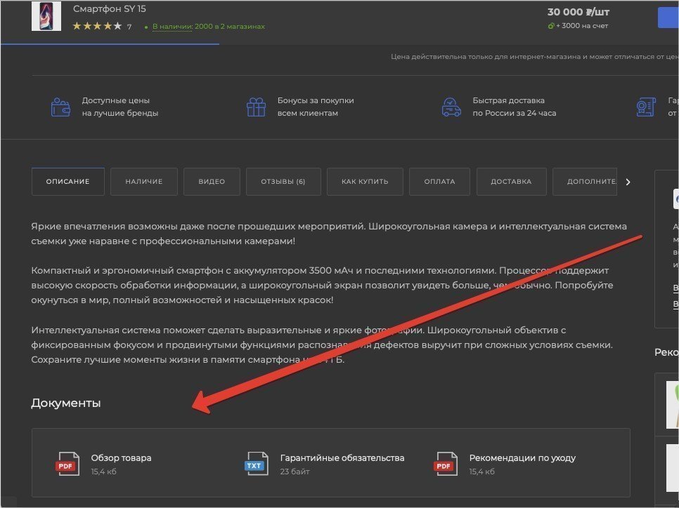 Для того чтобы пользователям легче было найти нужную информацию, был создан отдельный таб «Документы и файлы». Теперь не нужно пролистывать всю информацию на странице товара для того чтобы добраться до этого блока.