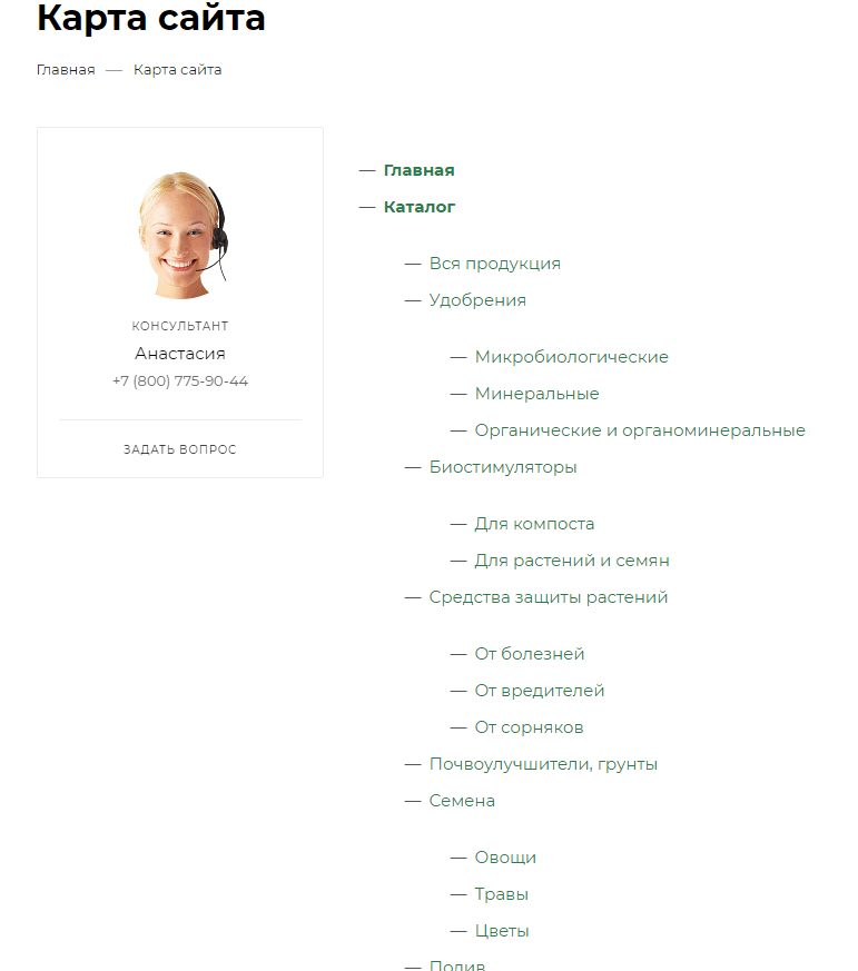 Создана страничная карта сайта, понятная для людей. Карта сайта содержит полный перечень ссылок на разделы и подразделы сайта. Отдельно был переработан контент сайта и скорректированы тексты.