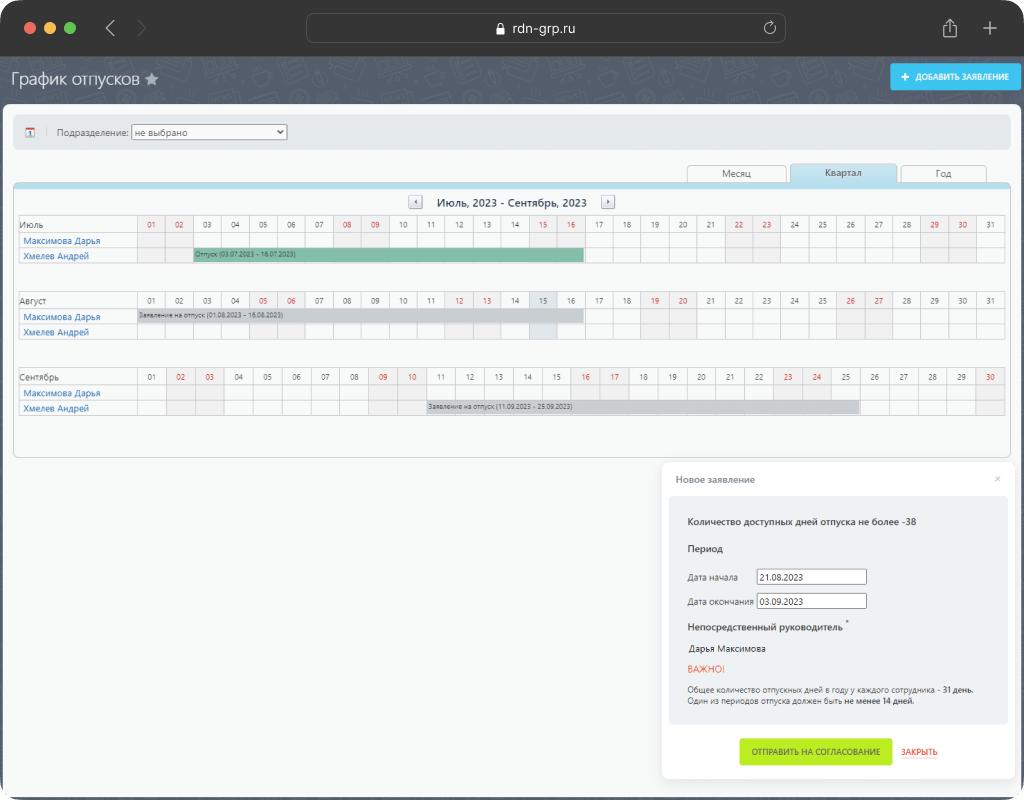 Из интерфейса «График отпусков» пользователь может посмотреть график отпусков коллеги и прямо в системе отправить заявление на отпуск, что позволяет исключить пересечения.