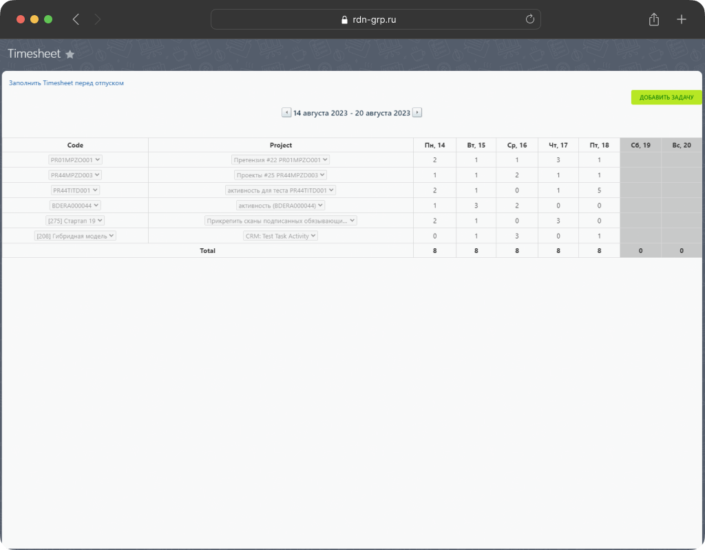 Функционал таймшитов внедрен для контроля рабочего времени, подсчета эффективности сотрудников и показывает, насколько сотрудник был задействован в проектных активностях, и какие сотрудники приносят компании наибольшую пользу.