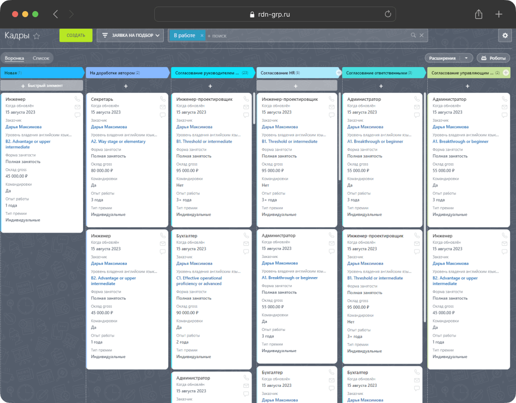 Контролировать процесс подбора в Kanban: видеть на каком этапе, сколько заявок или сколько офферов находятся на стадии согласования.