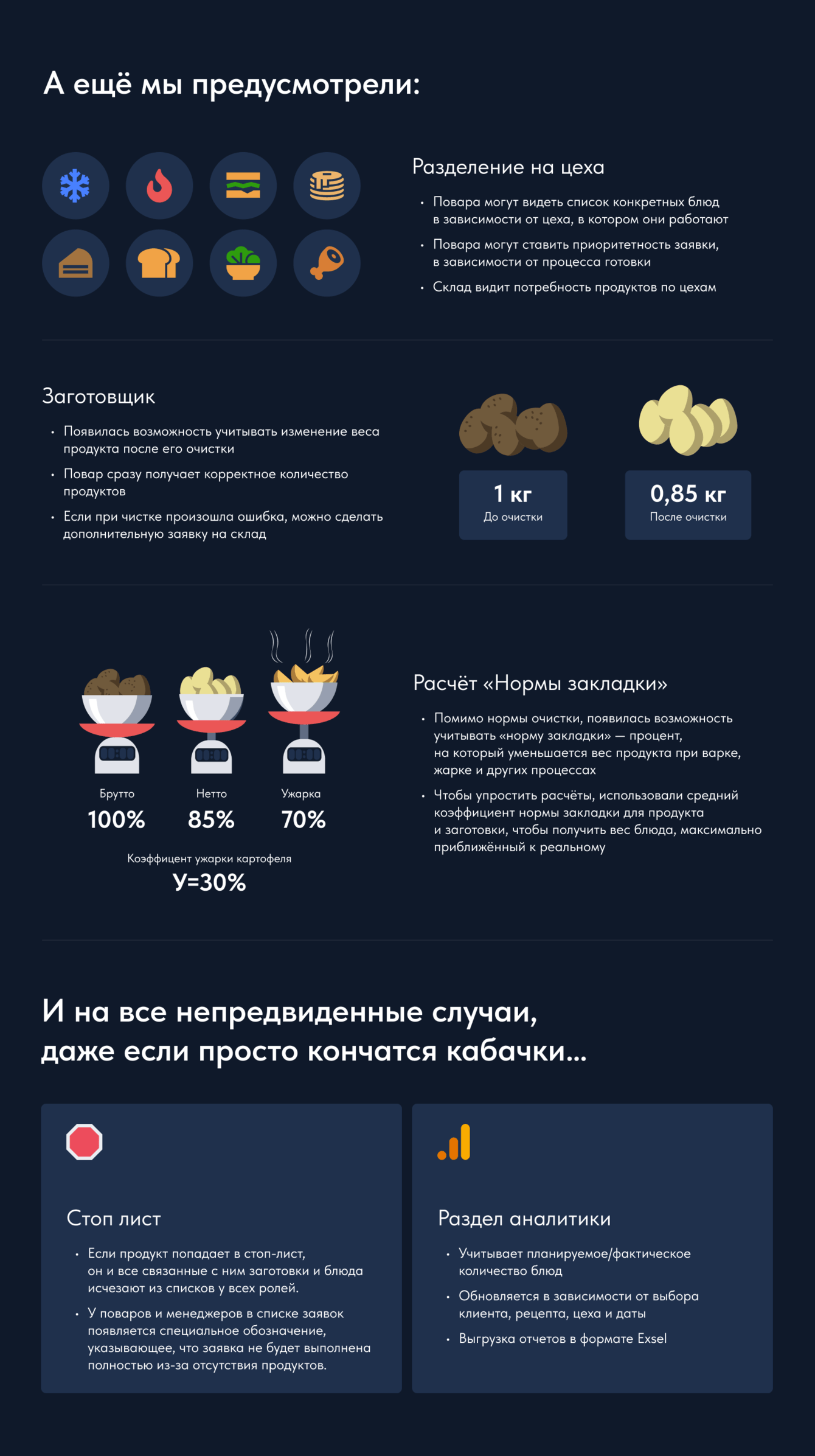 При разработке дизайна мы учитывали, что большинство сотрудников предприятия будут пользоваться сервисом либо с телефонов (склад), либо со специальных экранов с тачпадами (кухня). Поэтому структура была спроектирована в первую очередь для планшетов и мобильных устройств.