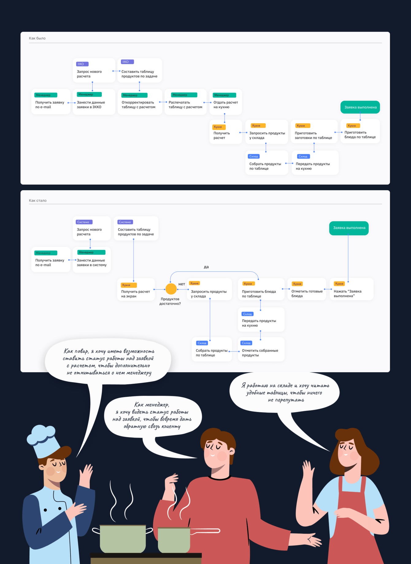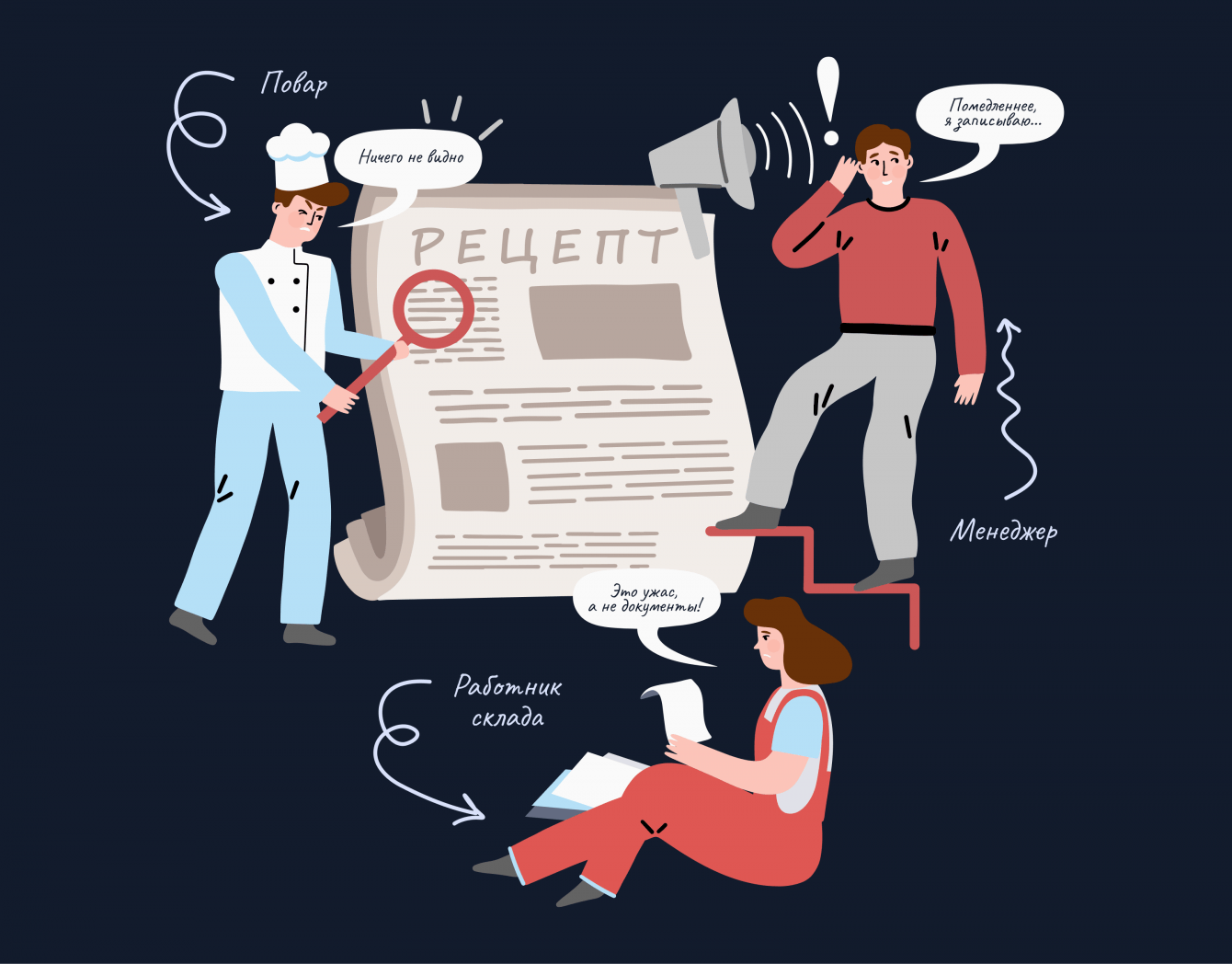 Затем мы проанализировали требования и ожидания сотрудников, создав User Story Map. В ходе анализа выяснилось, что менеджеры тратят много времени на предварительную обработку заявок и подготовку списков для следующих этапов. Повара и сотрудники склада часто путаются и совершают ошибки из-за мелкого шрифта на бумажных таблицах, в которых постоянно нужно что-то отмечать. Еще одна сложность заключается в том, что бумажные таблицы не предусматривают иерархическое деление рецепта: блюдо – заготовка – продукт. Все коммуникации между отделами происходят лично, что требует физического перемещения для уточнения и обновления информации.