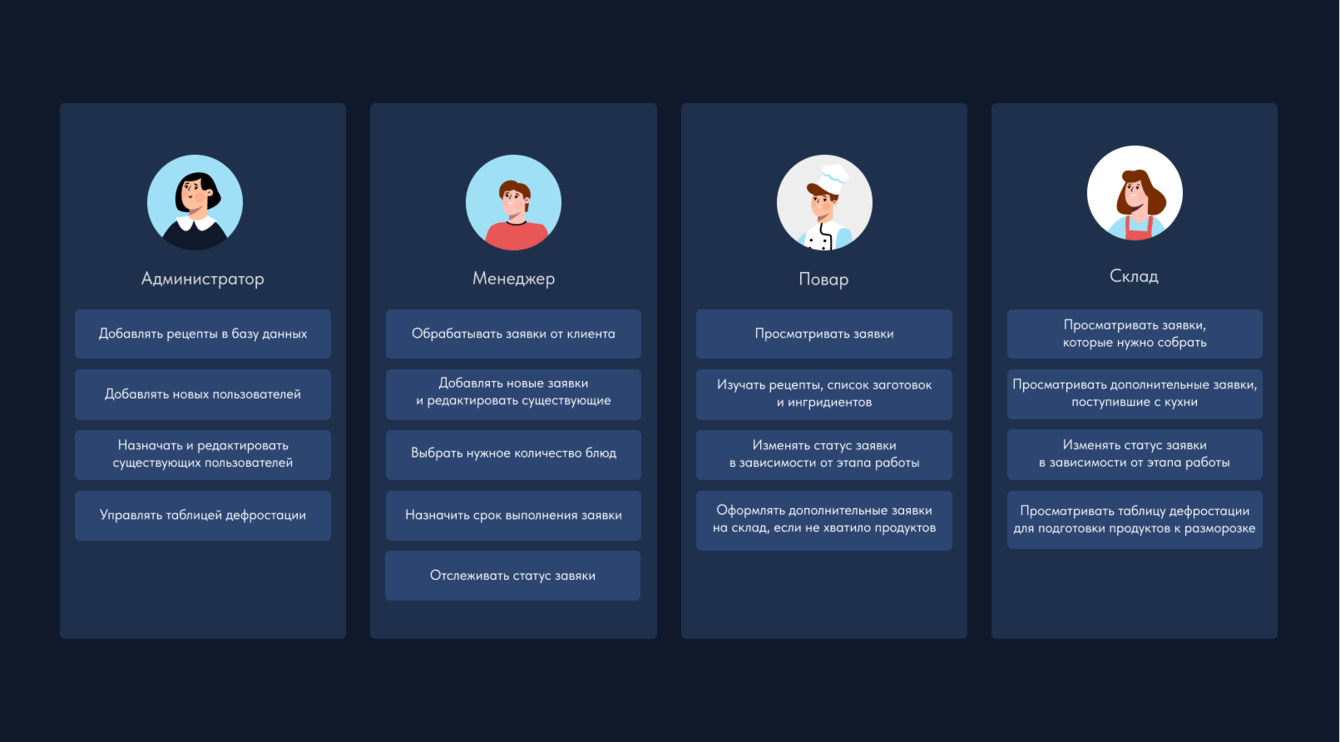 Затем началась совместная работа над функциональностью как на фронтенде (например, работа фильтров, поиск, изменение приоритета заявки и др.), так и на бэкенде (например, установка связей между блюдами, заготовками и продуктами, хранение и получение заявок, настройка связей между ролями и др.). На заключительном этапе необходимо было интегрировать фронтенд и бэкенд, чтобы данные корректно передавались между ними.