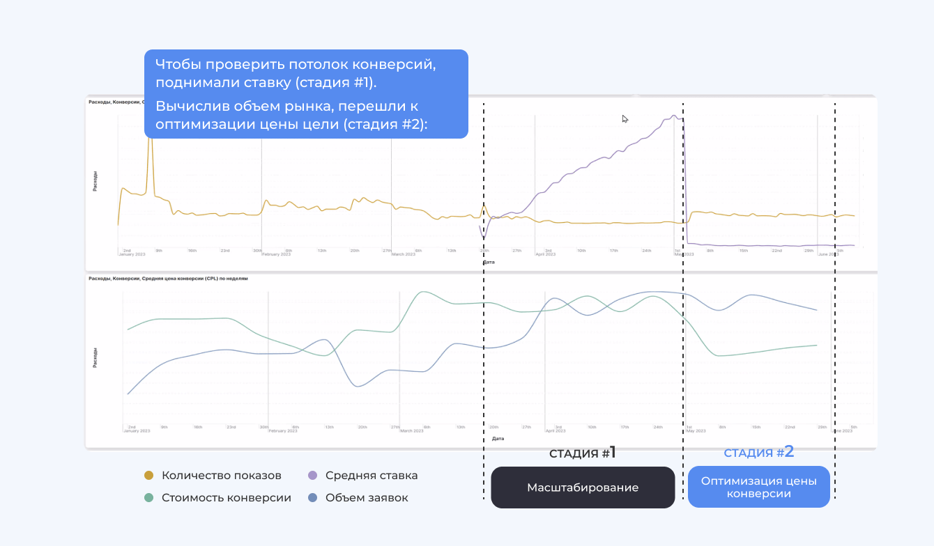 Начали с проверки первой гипотезы: управляли закупкой, повышая ставки по критериям показа. С помощью этих действий определили “потолок” по количеству конверсий.