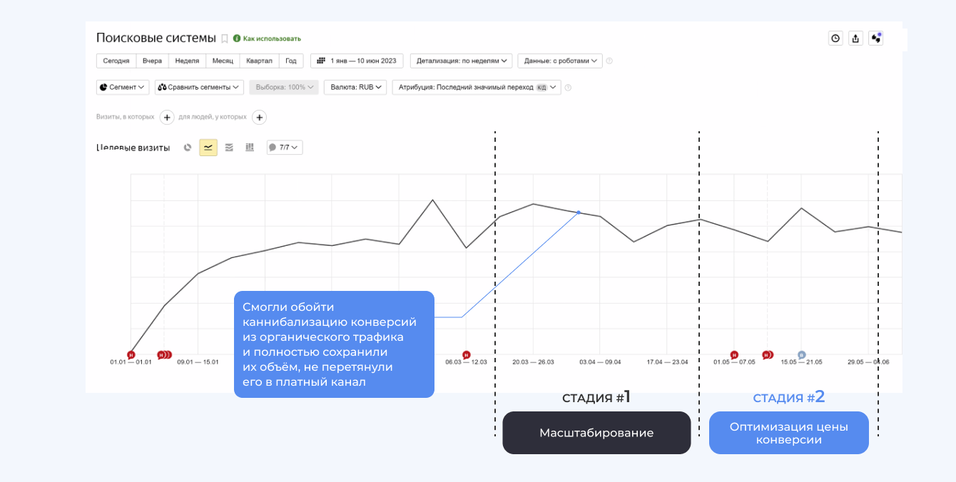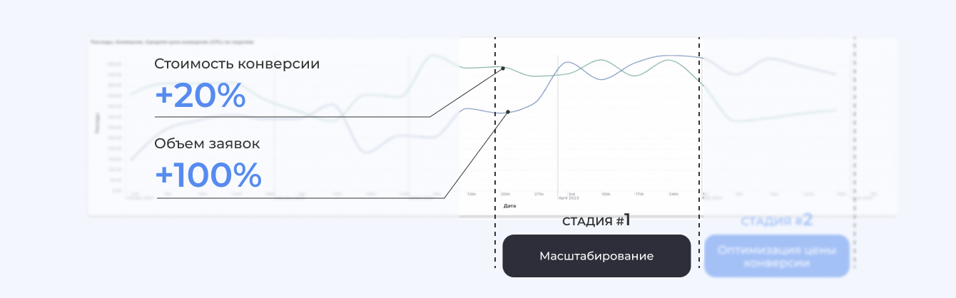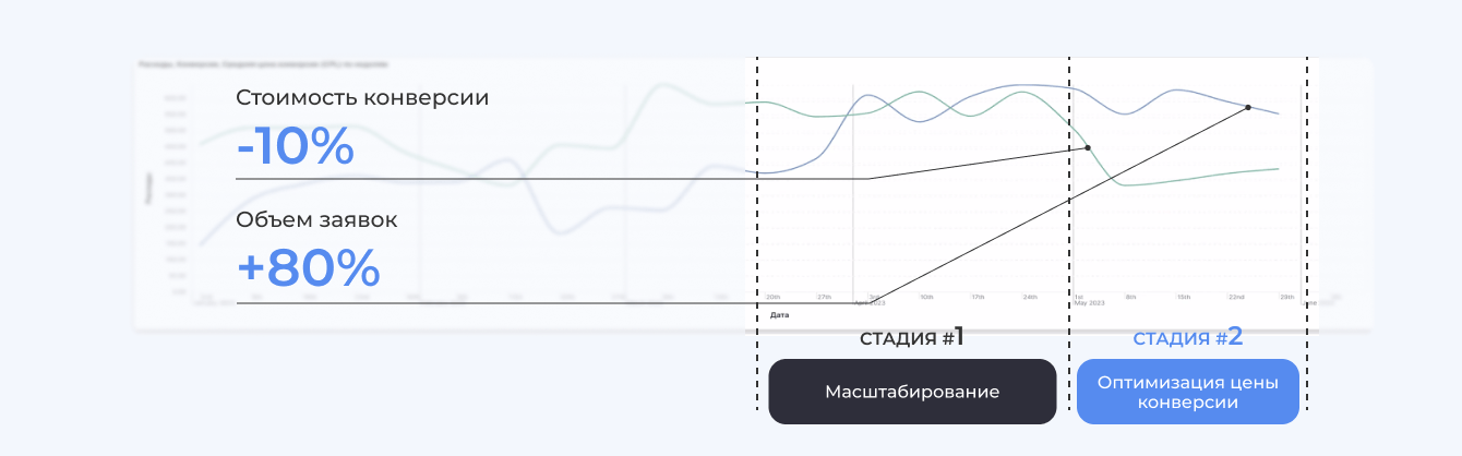 Во второй этап работы мы изменили стратегию назначения ставок в Яндекс Директ. Теперь перед Андатой стояла задача снизить целевую цену конверсии, но важно было сильно не потерять в объеме конверсий. На этом эатпе получили объем конверсий близкий к “потолку”, который вычислили на предыдущем этапе масштабирования рекламных кампаний, при этом цену конверсии получили не только ниже, чем была на этапе масштабирования и даже ниже, чем до старта проекта.
