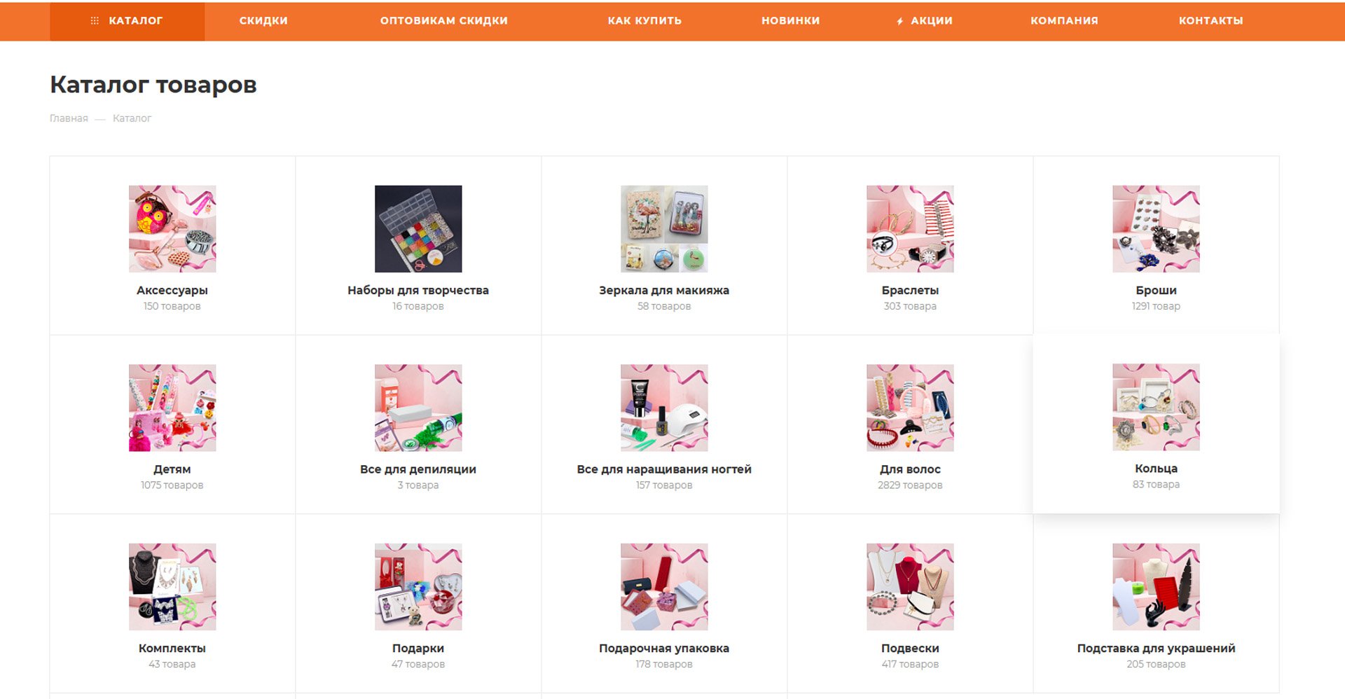 Под основным баннером — наглядные блоки самых востребованных категорий: браслеты, броши, кольца, цепи, аксессуары... Каждый — с реальным фото, чётким названием и одним кликом в раздел. Никаких «навигационных лабиринтов» — клиент видит, что ему нужно, и сразу попадает туда, где товары ждут заказа.