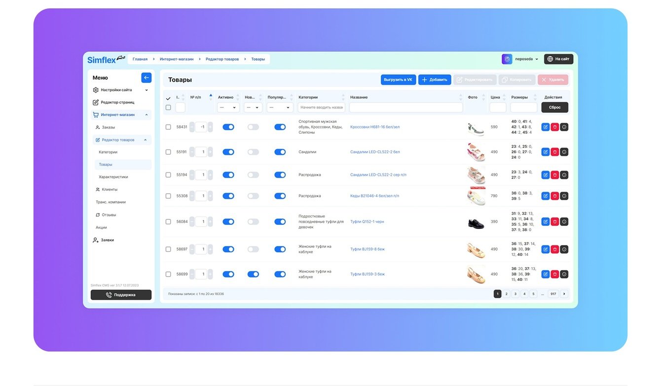 Сайт собран на нашей удобной админке «Simflex CMS», где есть всё необходимое для того, чтобы управлять товарами и контентом. Администраторы сайта могут редактировать товары, заказы, добавлять акции, модерировать отзывы и многое другое. При этом, обучение нашей административной панели заняло всего 1 час.
