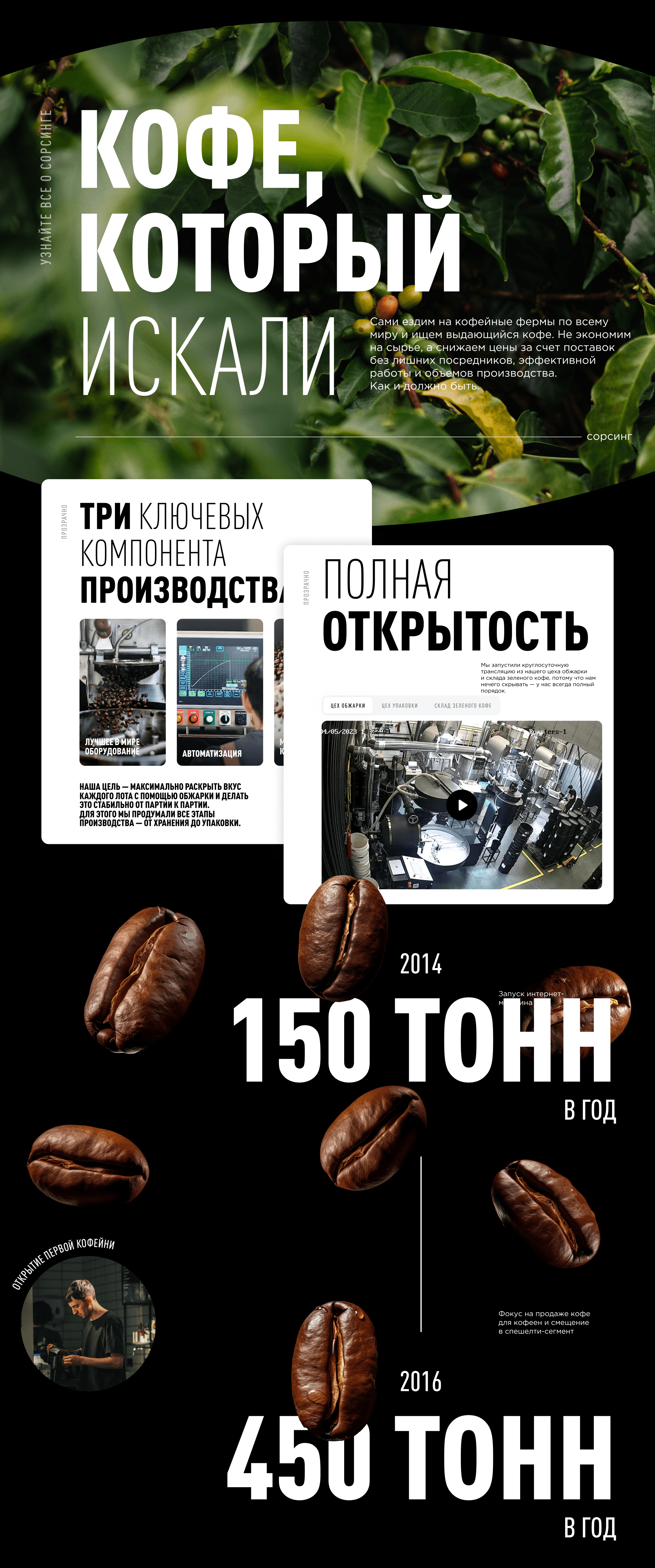 В основе концепции — дух ребят из «Тэйсти кофе», которые привыкли громко рассказывать об индустрии и своей команде. Крупные фотоиллюстрации и видеоролики расширенного формата вместе с акцидентной типографикой отлично раскрывают эту идею, выходя за привычные рамки.