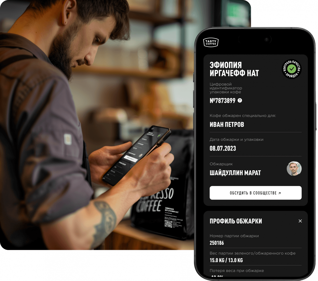 Отличительная черта «Тэйсти кофе» — индивидуальная обжарка. Каждая упаковка сопровождается куаркодом, который ведет на специальный отчет с именем обжарщика, цветом зерен по колориметру и другими деталями. Мы его переосмыслили, сделав более дружелюбным.