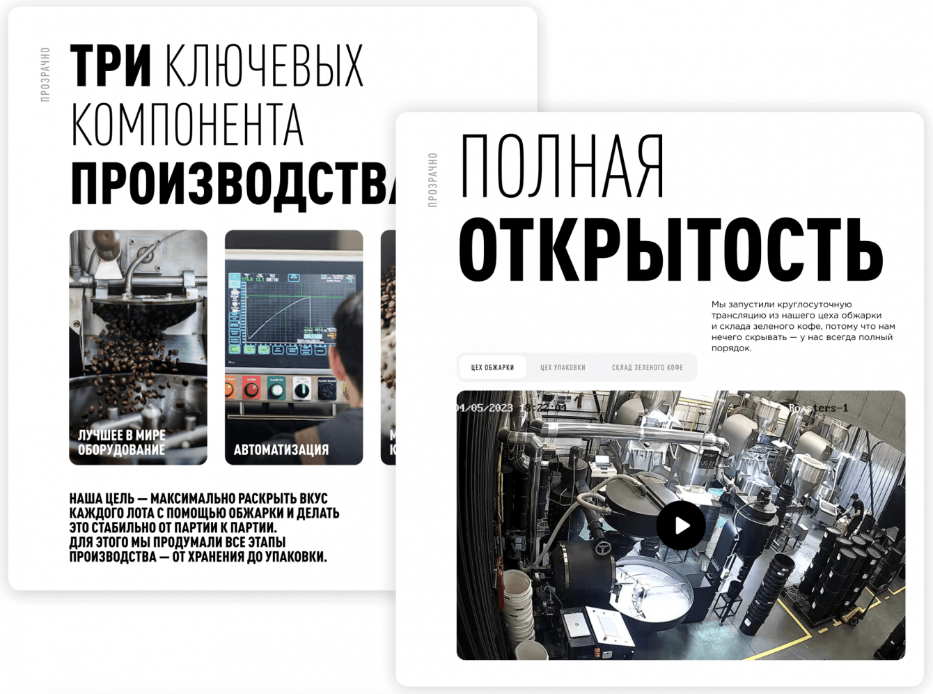 Одной из ключевых ценностей компании является открытость производства. Поэтому есть онлайн-трансляция для наблюдения за процессом обжарки и фасовки.