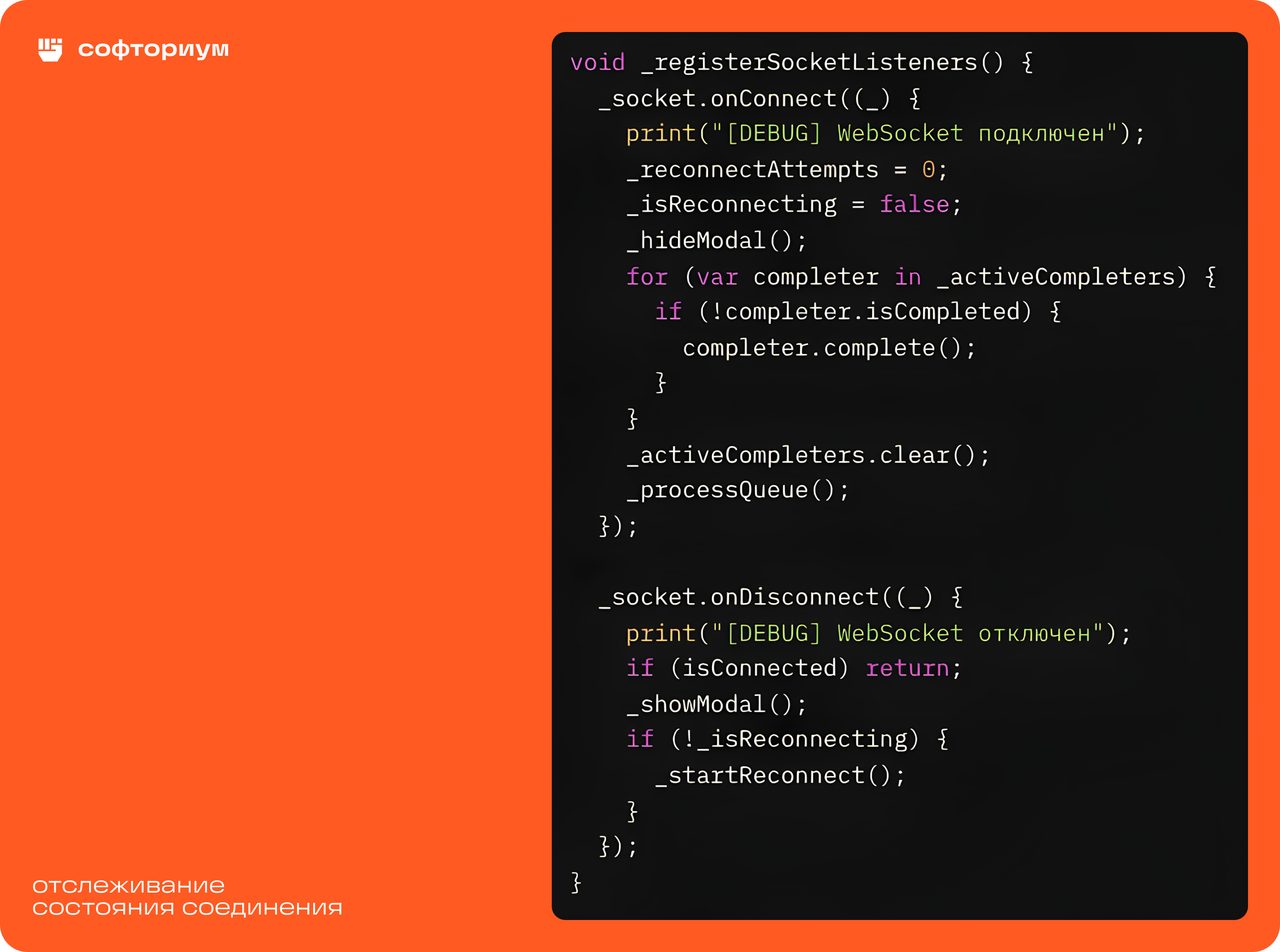 Для решения проблемы я реализовал кастомную логику быстрого восстановления соединения, которая учитывает особенности мобильных приложений. В основе решения лежит класс SocketService, который управляет WebSocket-соединением с использованием пакета socket_io_client для Flutter. Вот как это работает: